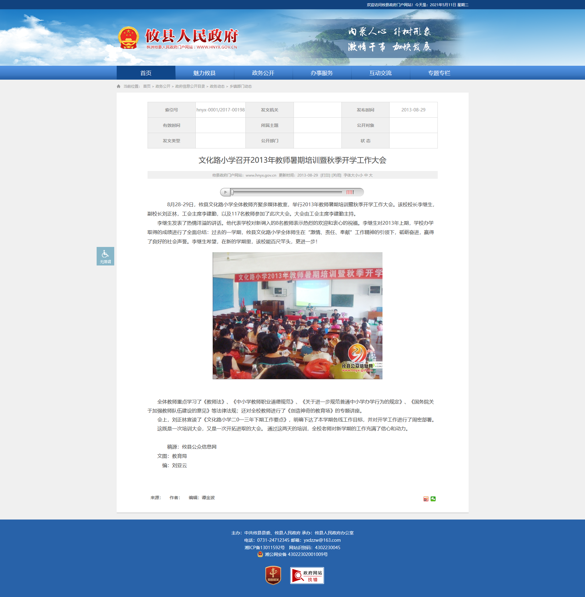 8月28-29日,攸县文化路小学全体教师齐聚多媒体教室,举行2013年教师暑期培训暨秋季开学工作大会。该校校长李继生,副校长刘正林,工会主席李建勤,以及117名教师参加了此次大会。大会由工会主席李建勤主持。