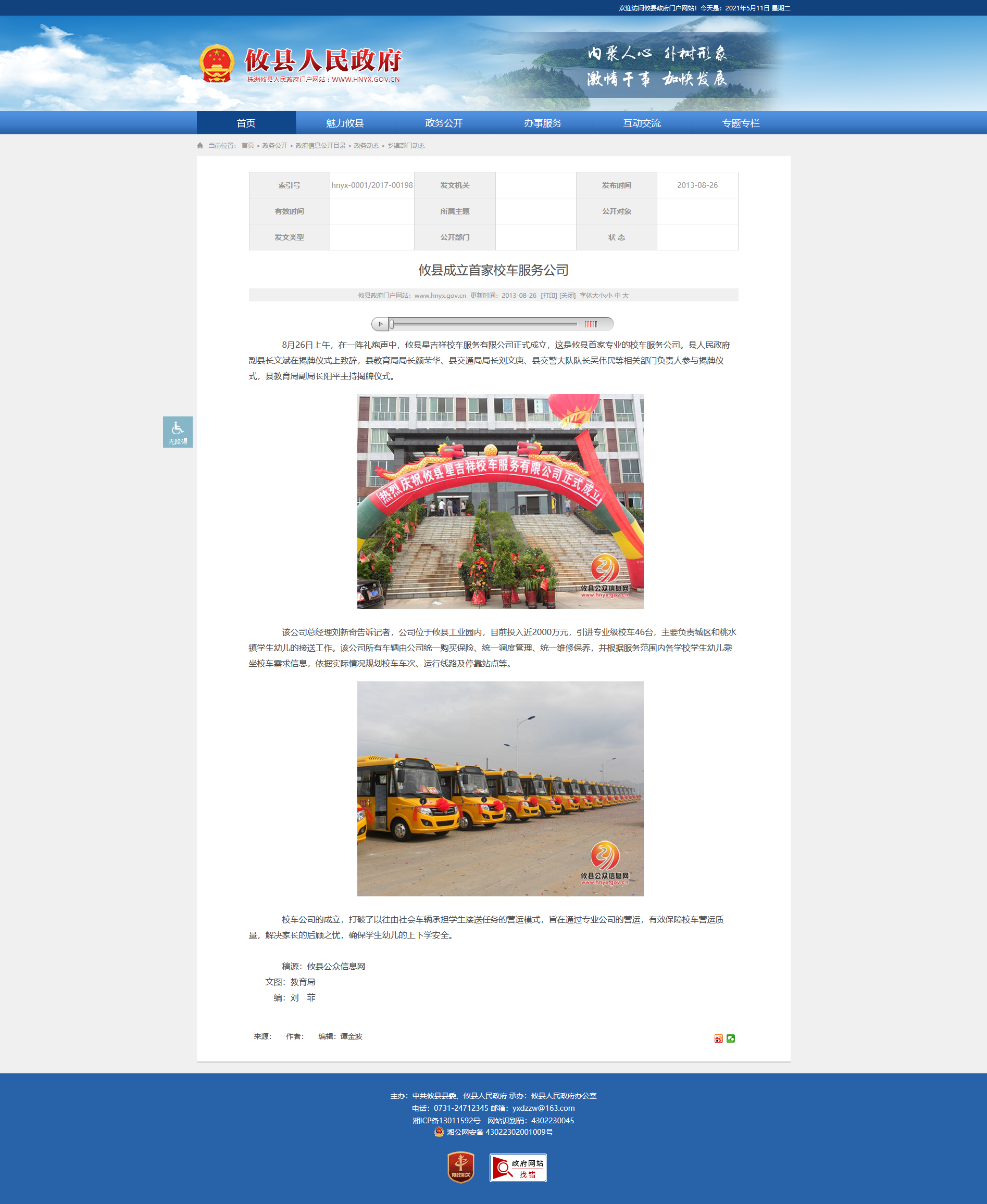 8月26日上午,在一阵礼炮声中,攸县星吉祥校车服务有限公司正式成立,这是攸县首家专业的校车服务公司。县人民政府副县长文斌在揭牌仪式上致辞,县教育局局长颜荣华、县交通局局长刘文庚、县交警大队队长吴伟民等相关部门负责人参与揭牌仪式,县教育局副局长阳平主持揭牌仪式。