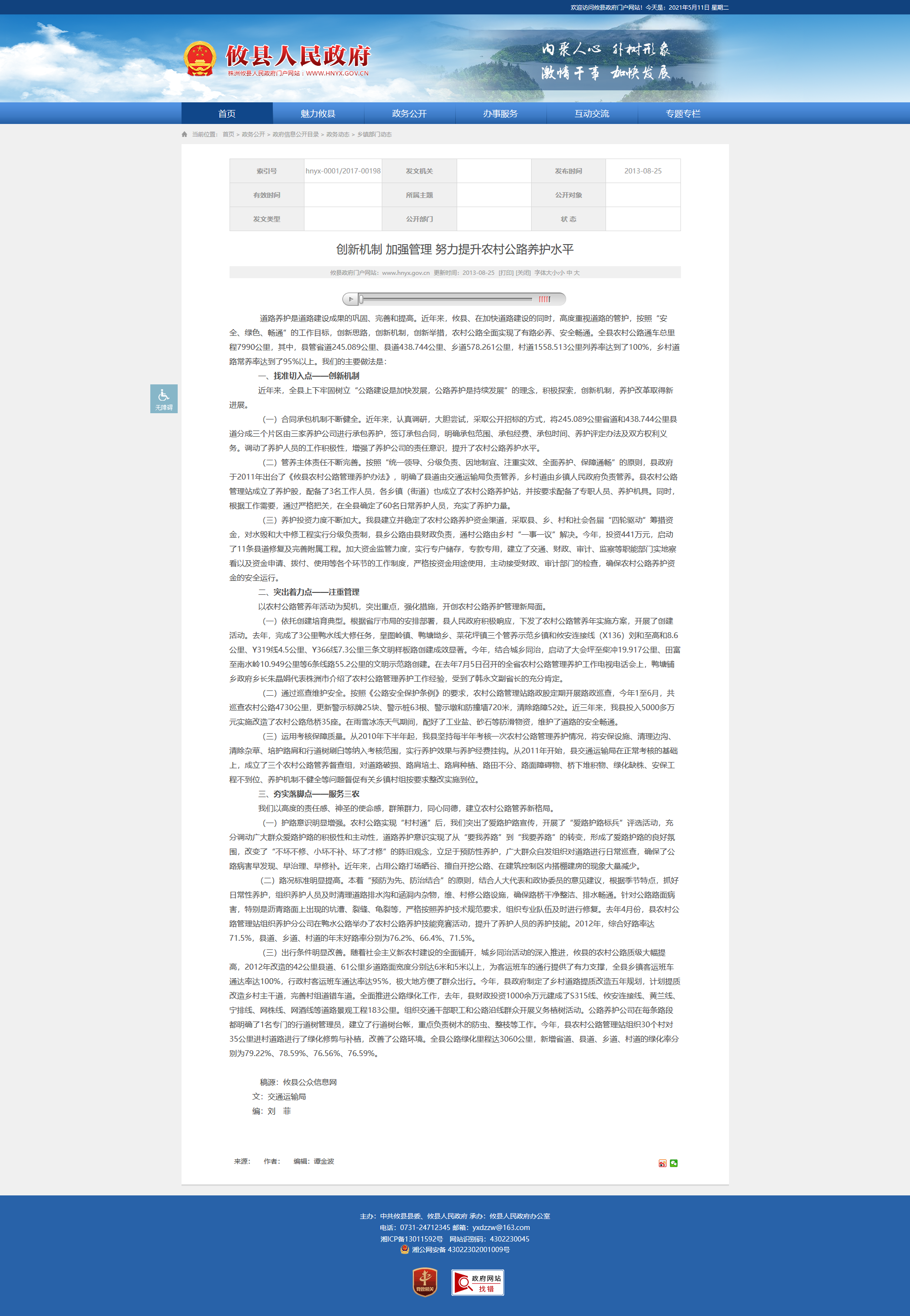道路养护是道路建设成果的巩固、完善和提高。近年来,攸县、在加快道路建设的同时,高度重视道路的管护,按照“安全、绿色、畅通”的工作目标,创新思路,创新机制,创新举措,农村公路全面实现了有路必养、安全畅通。全县农村公路通车总里程7990公里,其中,县管省道245.089公里、县道438.744公里、乡道578.261公里,村道1558.513公里列养率达到了100%,乡村道路常养率达到了95%以上。我们的主要做法是: