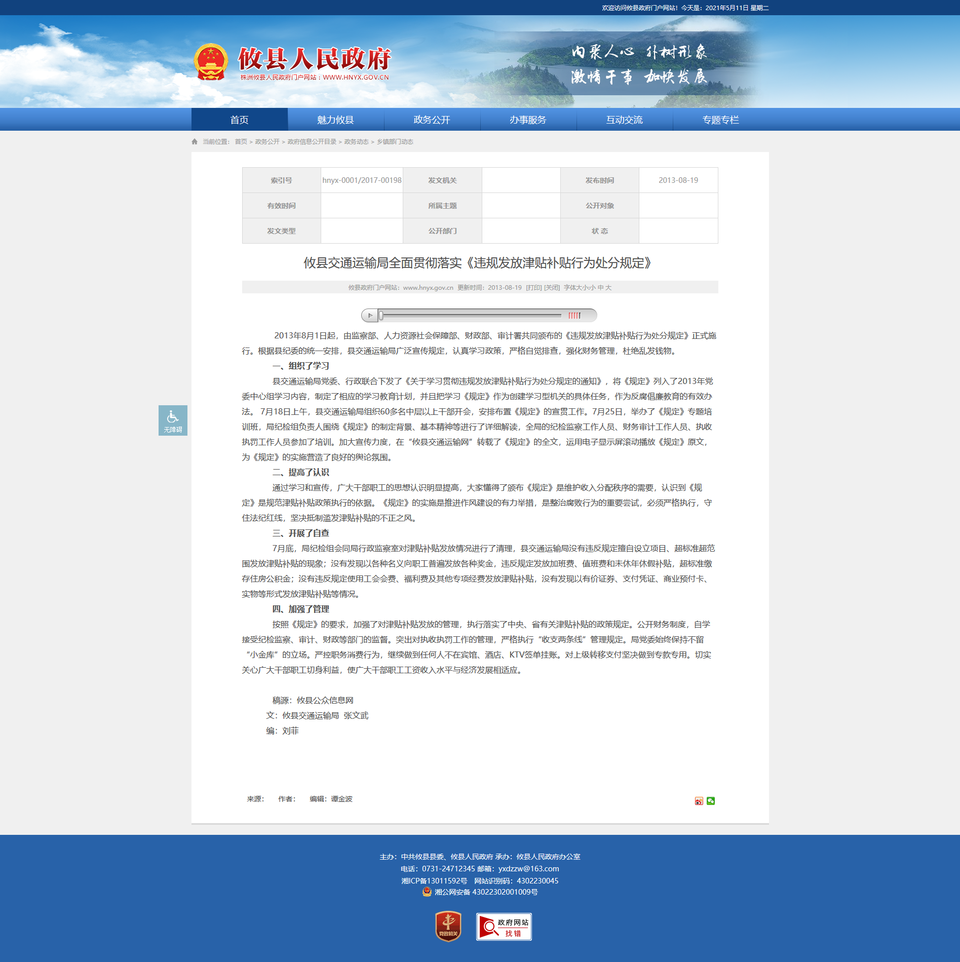 2013年8月1日起,由监察部、人力资源社会保障部、财政部、审计署共同颁布的《违规发放津贴补贴行为处分规定》正式施行。根据县纪委的统一安排,县交通运输局广泛宣传规定,认真学习政策,严格自觉排查,强化财务管理,杜绝乱发钱物。