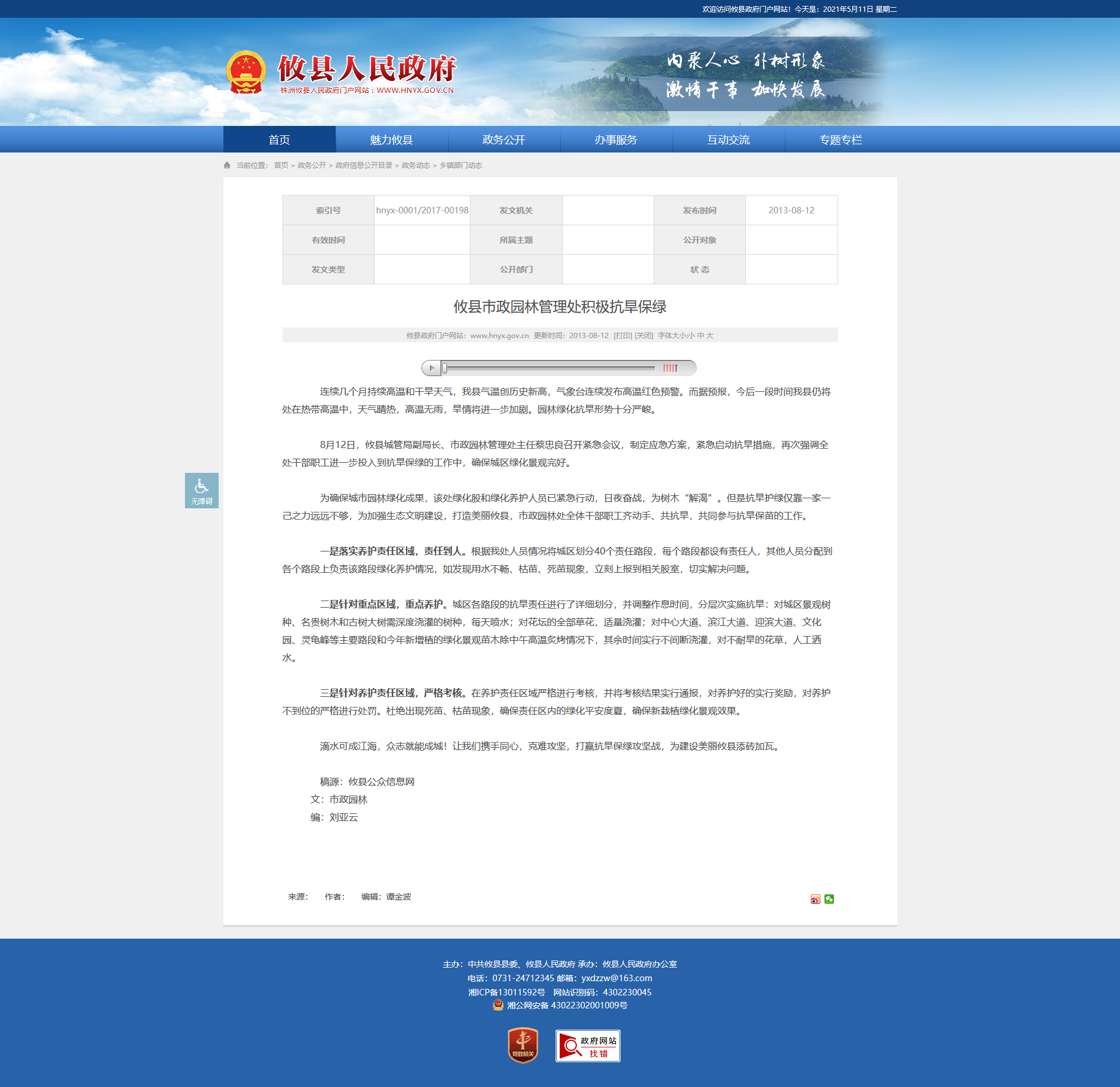 连续几个月持续高温和干旱天气,我县气温创历史新高,气象台连续发布高温红色预警。而据预报,今后一段时间我县仍将处在热带高温中,天气晴热,高温无雨,旱情将进一步加剧。园林绿化抗旱形势十分严峻。