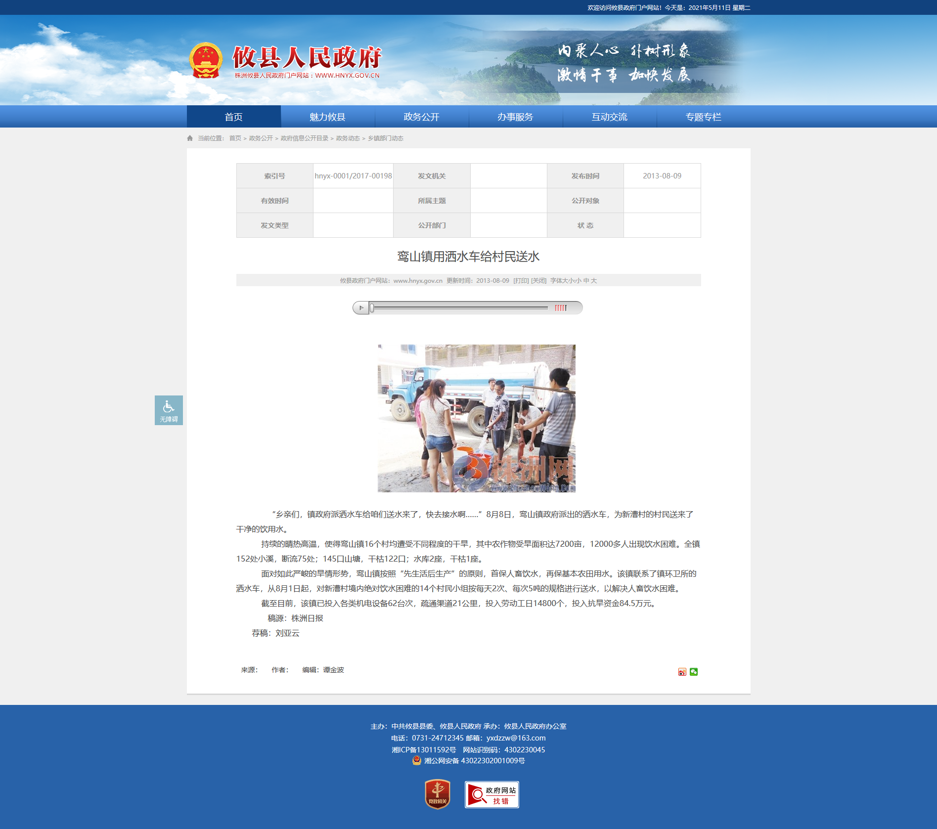 “乡亲们,镇政府派洒水车给咱们送水来了,快去接水啊……”8月8日,鸾山镇政府派出的洒水车,为新漕村的村民送来了干净的饮用水。