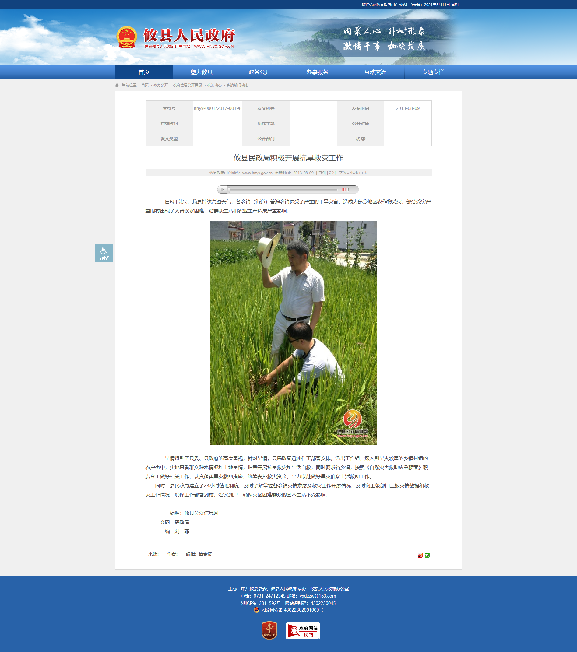 旱情得到了县委、县政府的高度重视,针对旱情,县民政局迅速作了部署安排,派出工作组,深入到旱灾较重的乡镇村组的农户家中,实地查看群众缺水情况和土地旱情,指导开展抗旱救灾和生活自救,同时要求各乡镇,按照《自然灾害救助应急预案》职责分工做好相关工作,认真落实旱灾救助措施,统筹安排救灾资金,全力以赴做好旱灾群众生活救助工作。
