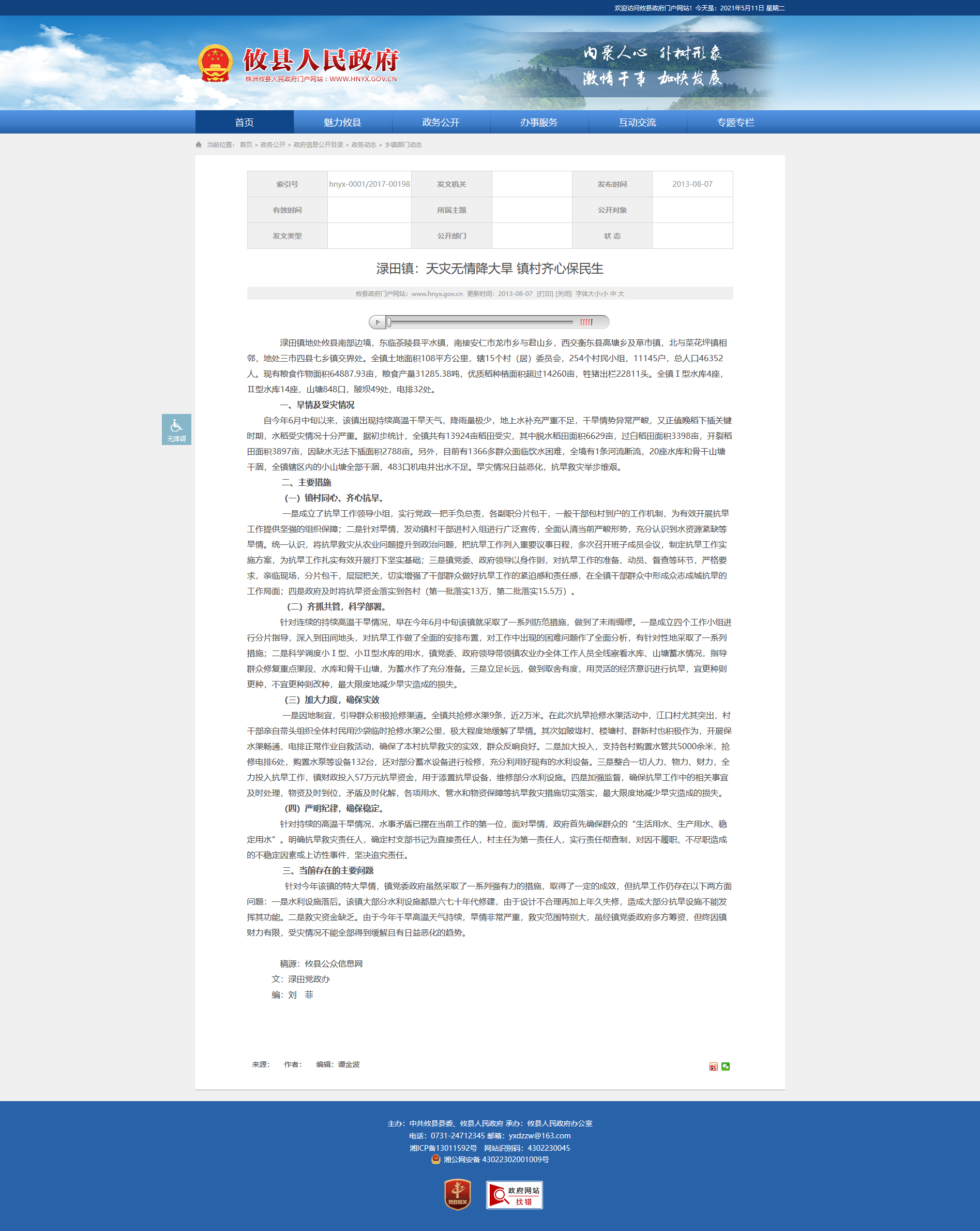 针对持续的高温干旱情况,水事矛盾已摆在当前工作的第一位,面对旱情,政府首先确保群众的“生活用水、生产用水、稳定用水”。明确抗旱救灾责任人,确定村支部书记为直接责任人,村主任为第一责任人,实行责任彻查制,对因不履职、不尽职造成的不稳定因素或上访性事件,坚决追究责任。