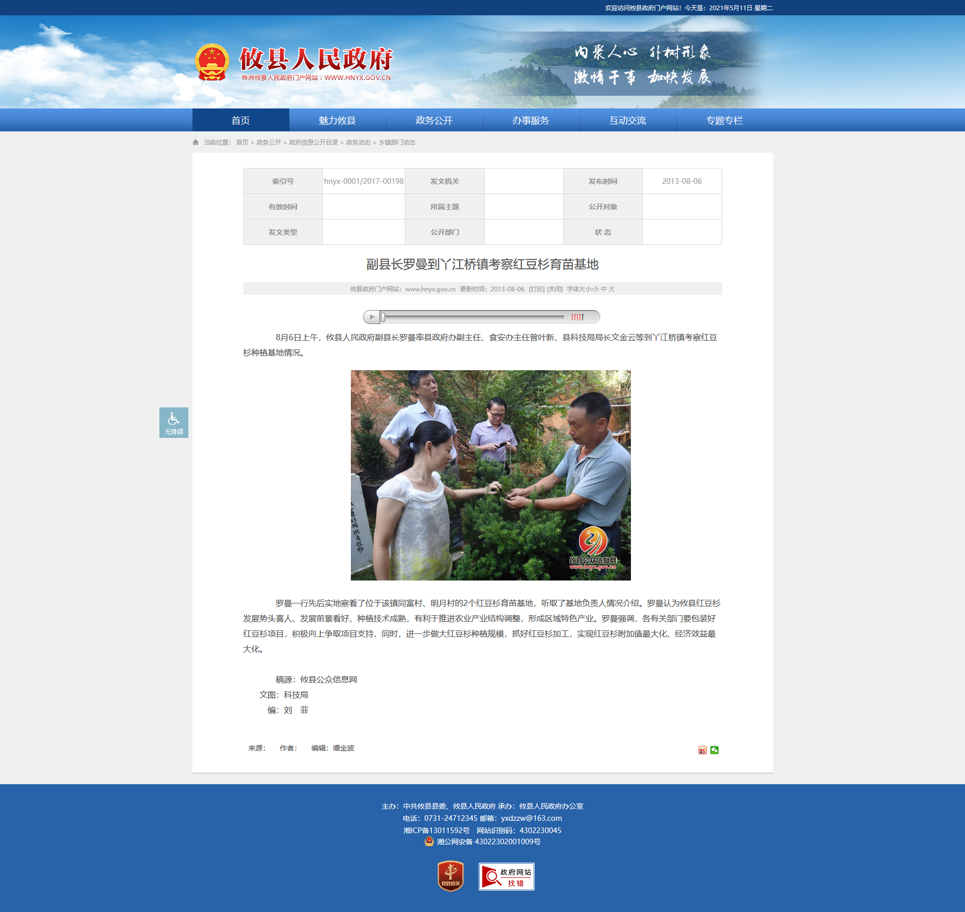 8月6日上午,攸县人民政府副县长罗曼率县政府办副主任、食安办主任曾叶新、县科技局局长文金云等到丫江桥镇考察红豆杉种植基地情况。