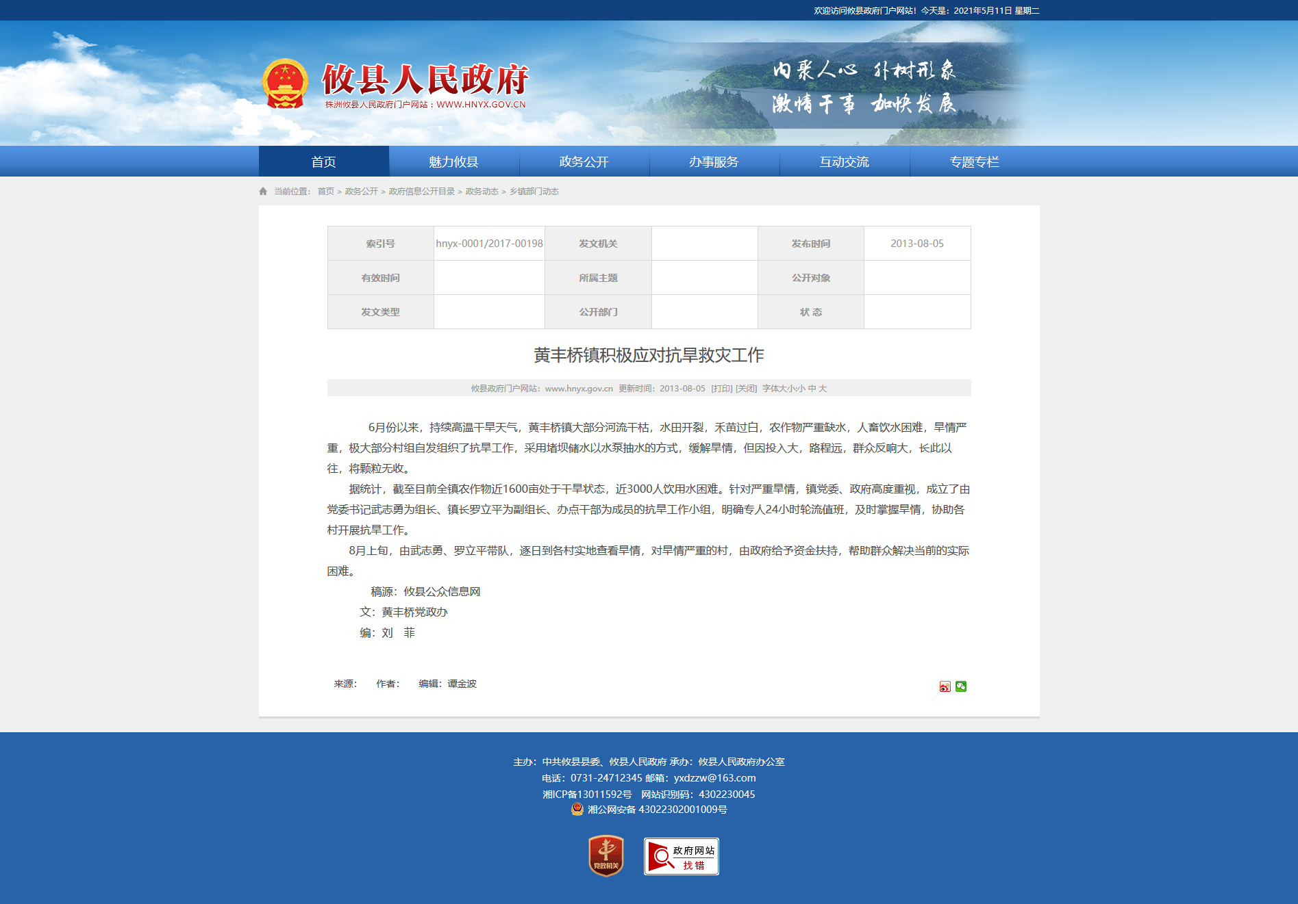 6月份以来,持续高温干旱天气,黄丰桥镇大部分河流干枯,水田开裂,禾苗过白,农作物严重缺水,人畜饮水困难,旱情严重,极大部分村组自发组织了抗旱工作,采用堵坝储水以水泵抽水的方式,缓解旱情,但因投入大,路程远,群众反响大,长此以往,将颗粒无收。
