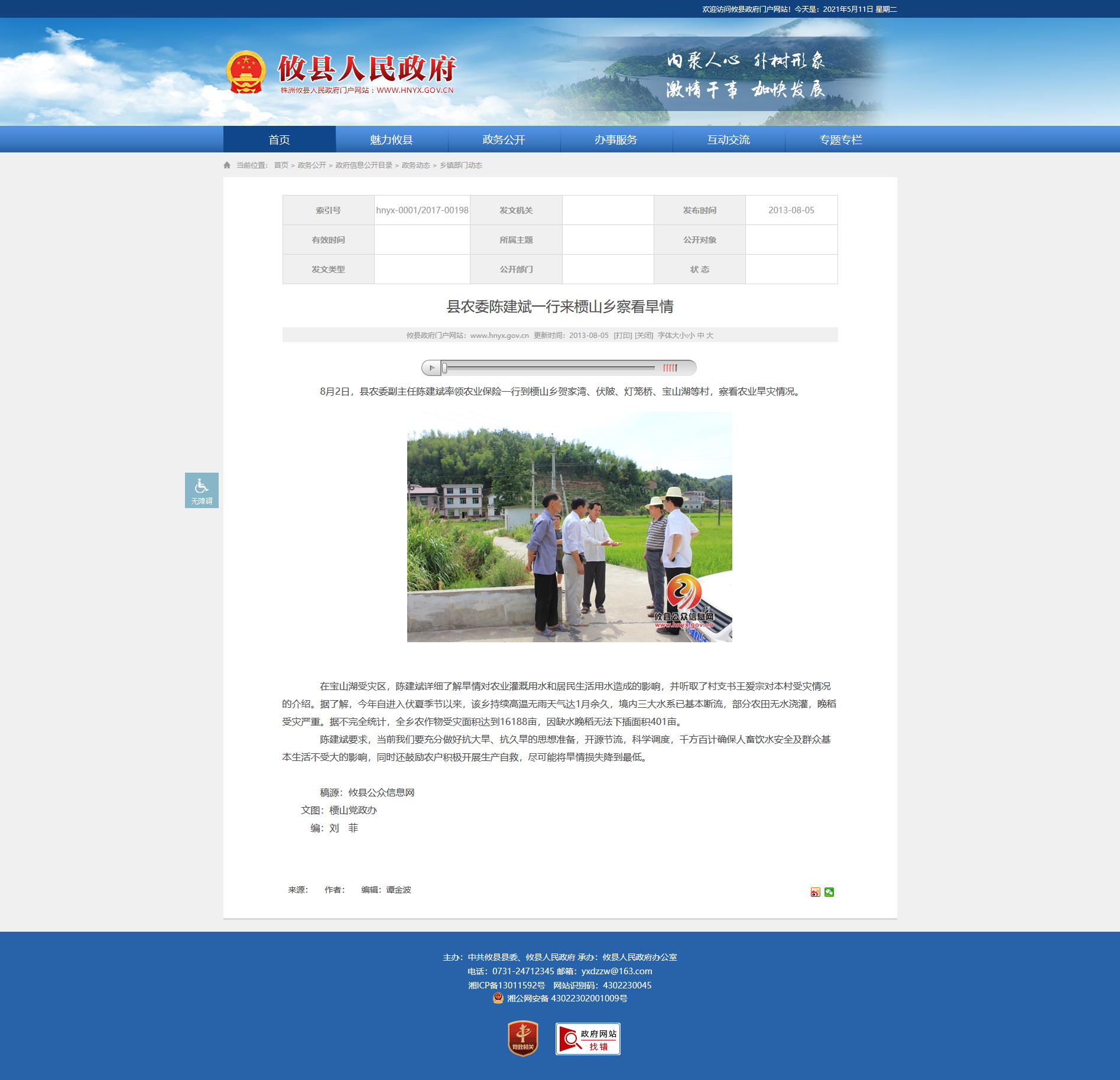 8月2日,县农委副主任陈建斌率领农业保险一行到槚山乡贺家湾、伏陂、灯笼桥、宝山湖等村,察看农业旱灾情况。