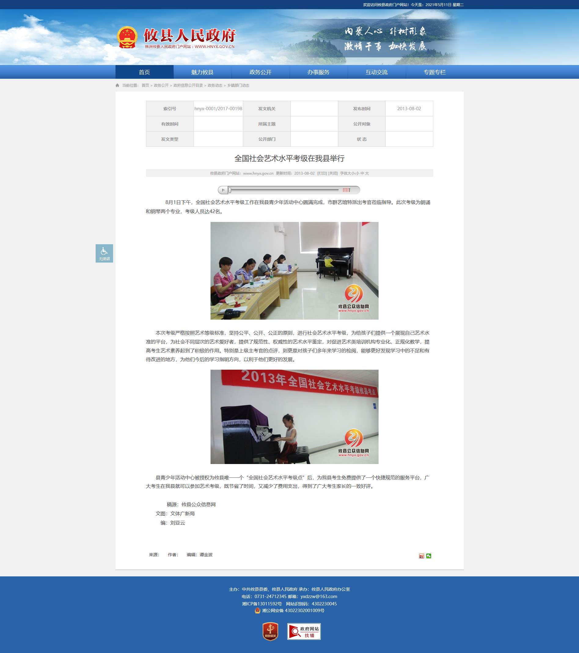 8月1日下午,全国社会艺术水平考级工作在我县青少年活动中心圆满完成,市群艺馆特派出考官莅临指导。此次考级为朗诵和钢琴两个专业,考级人员达42名。