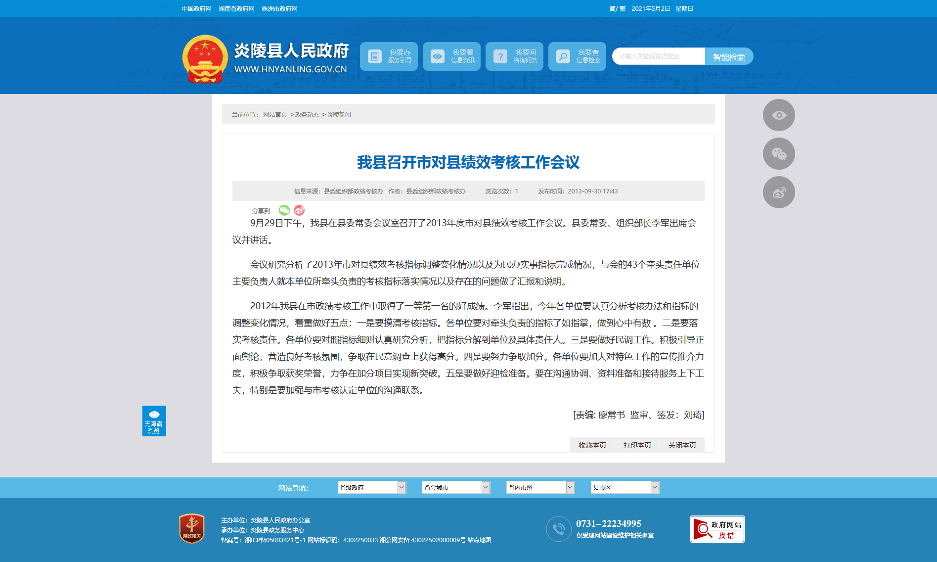 2012年我县在市政绩考核工作中取得了一等第一名的好成绩。李军指出,今年各单位要认真分析考核办法和指标的调整变化情况,着重做好五点:一是要摸清考核指标。各单位要对牵头负责的指标了如指掌,做到心中有数 。二是要落实考核责任。各单位要对照指标细则认真研究分析,把指标分解到单位及具体责任人。三是要做好民调工作。积极引导正面舆论,营造良好考核氛围,争取在民意调查上获得高分。四是要努力争取加分。各单位要加大对特色工作的宣传推介力度,积极争取获奖荣誉,力争在加分项目实现新突破。五是要做好迎检准备。要在沟通协调、资料准备和接待服务上下工夫,特别是要加强与市考核认定单位的沟通联系。