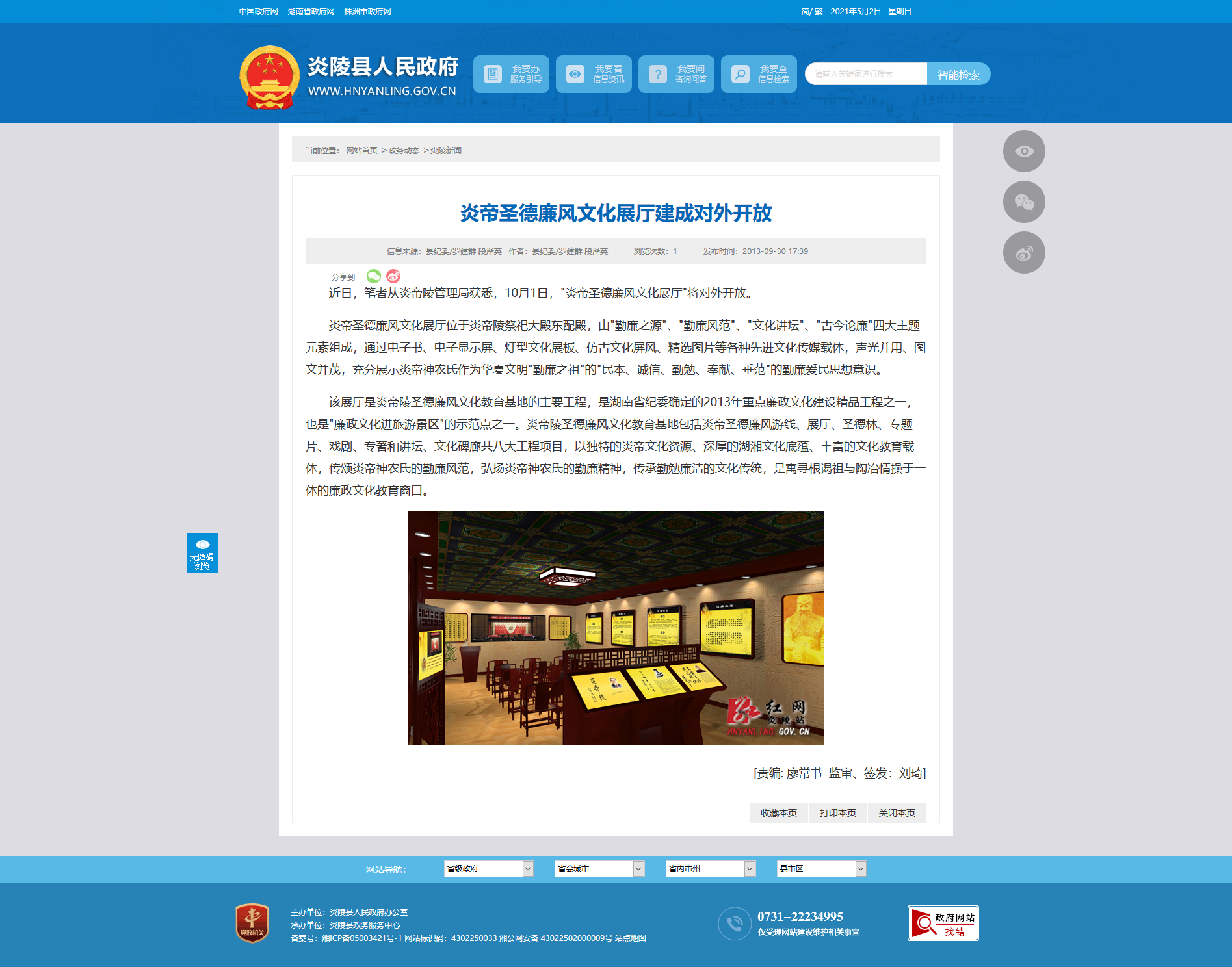 近日,笔者从炎帝陵管理局获悉,10月1日,"炎帝圣德廉风文化展厅"将对外开放。