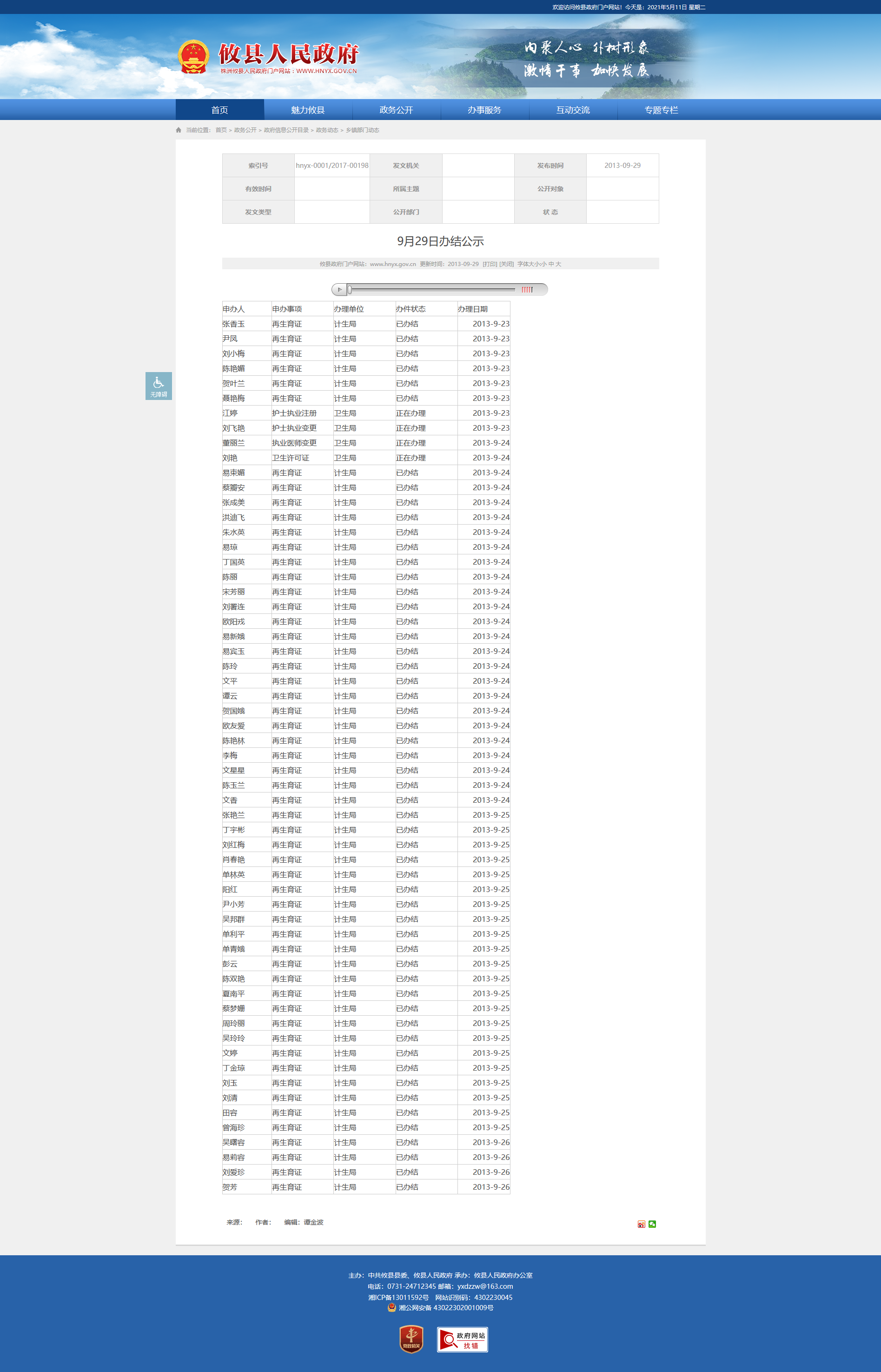 | 彭云 | 再生育证 | 计生局 | 已办结 | 2013-9-25 |