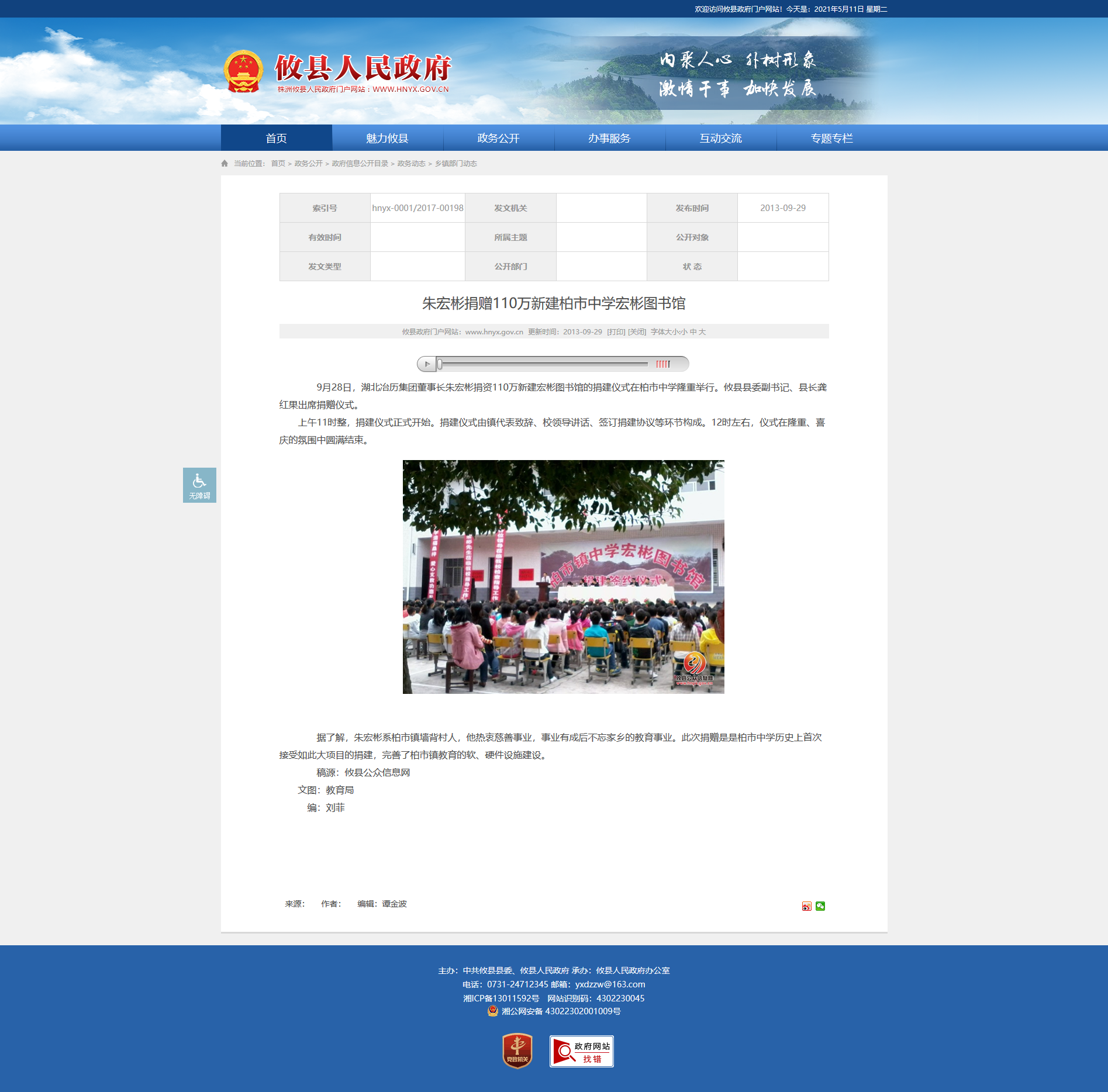 9月28日,湖北冶历集团董事长朱宏彬捐资110万新建宏彬图书馆的捐建仪式在柏市中学隆重举行。攸县县委副书记、县长龚红果出席捐赠仪式。