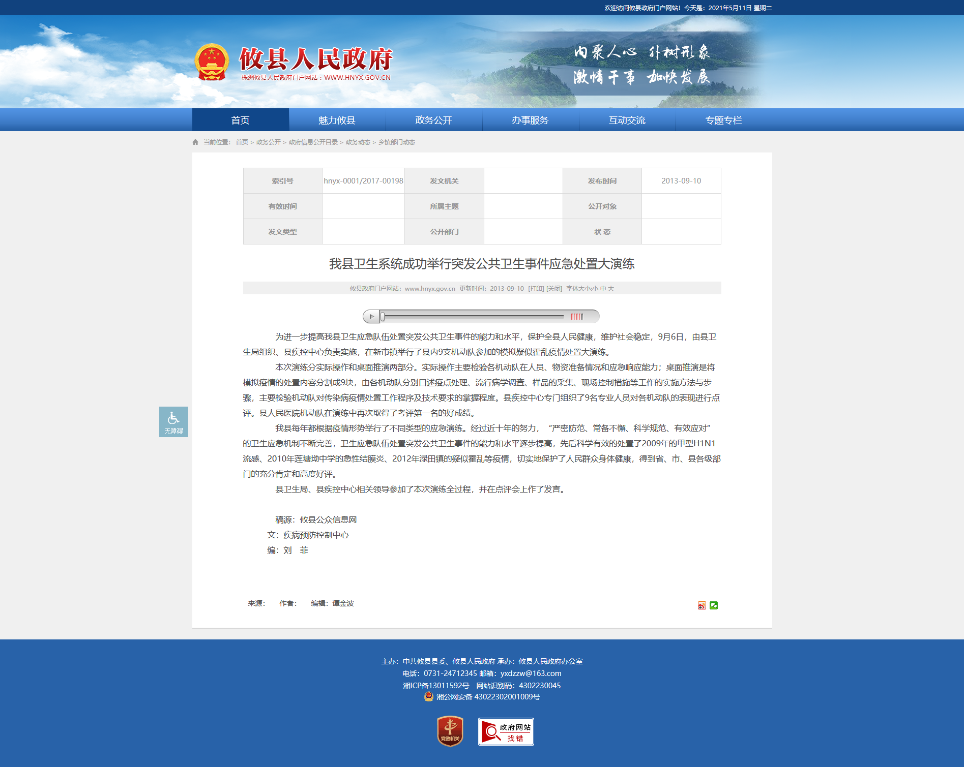我县每年都根据疫情形势举行了不同类型的应急演练。经过近十年的努力,“严密防范、常备不懈、科学规范、有效应对”的卫生应急机制不断完善,卫生应急队伍处置突发公共卫生事件的能力和水平逐步提高,先后科学有效的处置了2009年的甲型H1N1流感、2010年莲塘坳中学的急性结膜炎、2012年渌田镇的疑似霍乱等疫情,切实地保护了人民群众身体健康,得到省、市、县各级部门的充分肯定和高度好评。