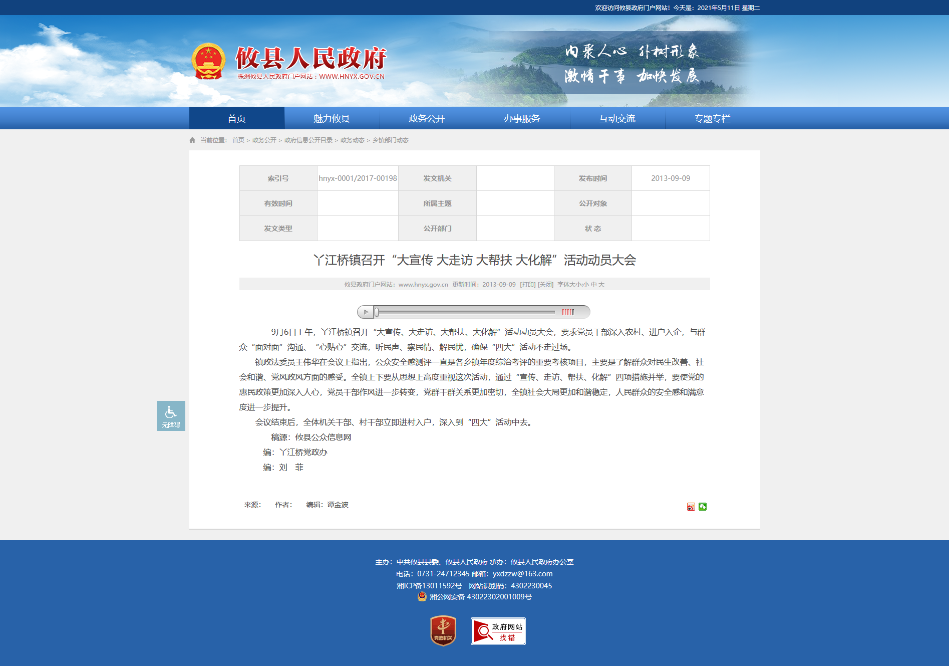 9月6日上午,丫江桥镇召开“大宣传、大走访、大帮扶、大化解”活动动员大会,要求党员干部深入农村、进户入企,与群众“面对面”沟通、“心贴心”交流,听民声、察民情、解民忧,确保“四大”活动不走过场。