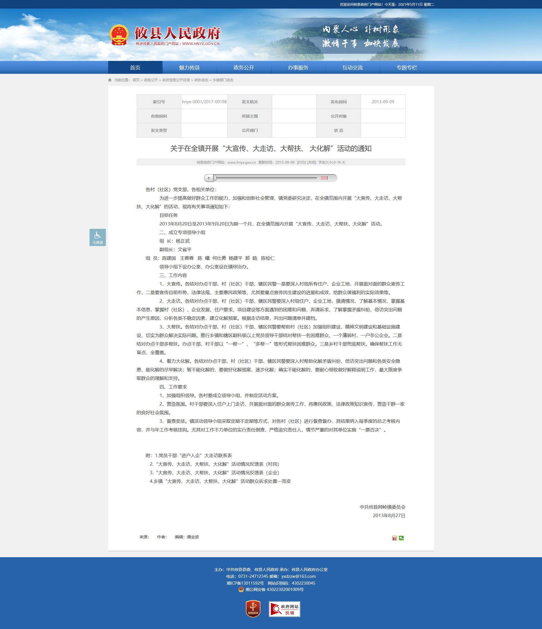 2013年8月20日至2013年9月20日为期一个月,在全镇范围内开展“大宣传、大走访、大帮扶、大化解”活动。