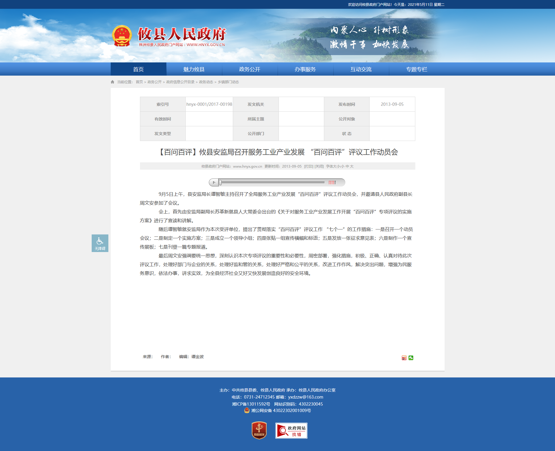 9月5日上午,县安监局长谭智敏主持召开了全局服务工业产业发展“百问百评”评议工作动员会,并邀请县人民政府副县长周文安参加了会议。
