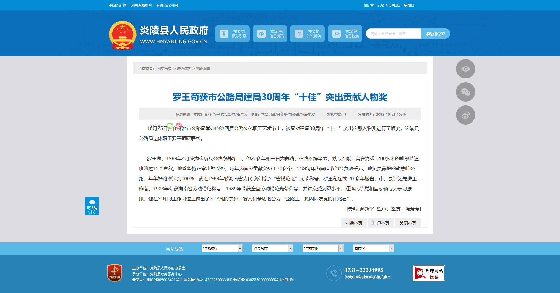 10月25日,在株洲市公路局举办的第四届公路文化职工艺术节上,该局对建局30周年“十佳”突出贡献人物奖进行了颁奖,炎陵县公路局退休职工罗王苟获表彰。