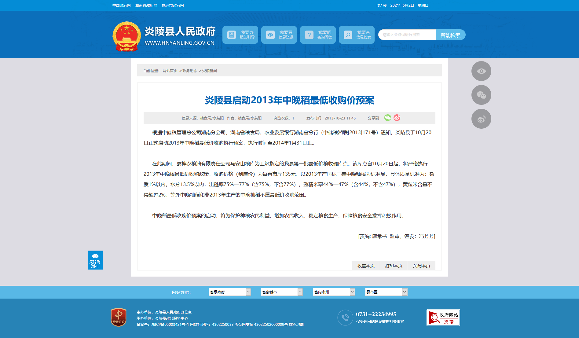 根据中储粮管理总公司湖南分公司、湖南省粮食局、农业发展银行湖南省分行(中储粮湘联[2013]171号)通知,炎陵县于10月20日正式启动2013年中晚稻最低价收购执行预案,执行时间至2014年1月31日止。