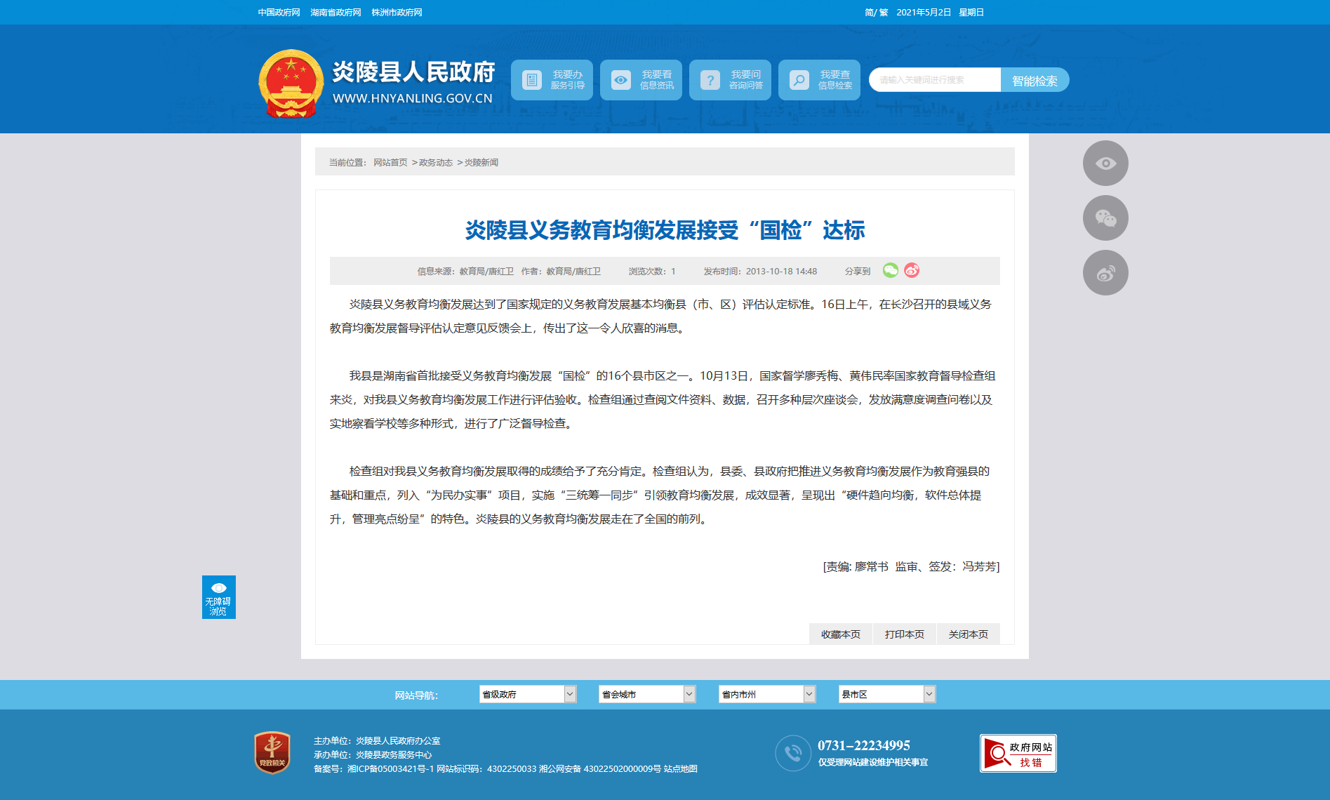炎陵县义务教育均衡发展达到了国家规定的义务教育发展基本均衡县(市、区)评估认定标准。16日上午,在长沙召开的县域义务教育均衡发展督导评估认定意见反馈会上,传出了这一令人欣喜的消息。