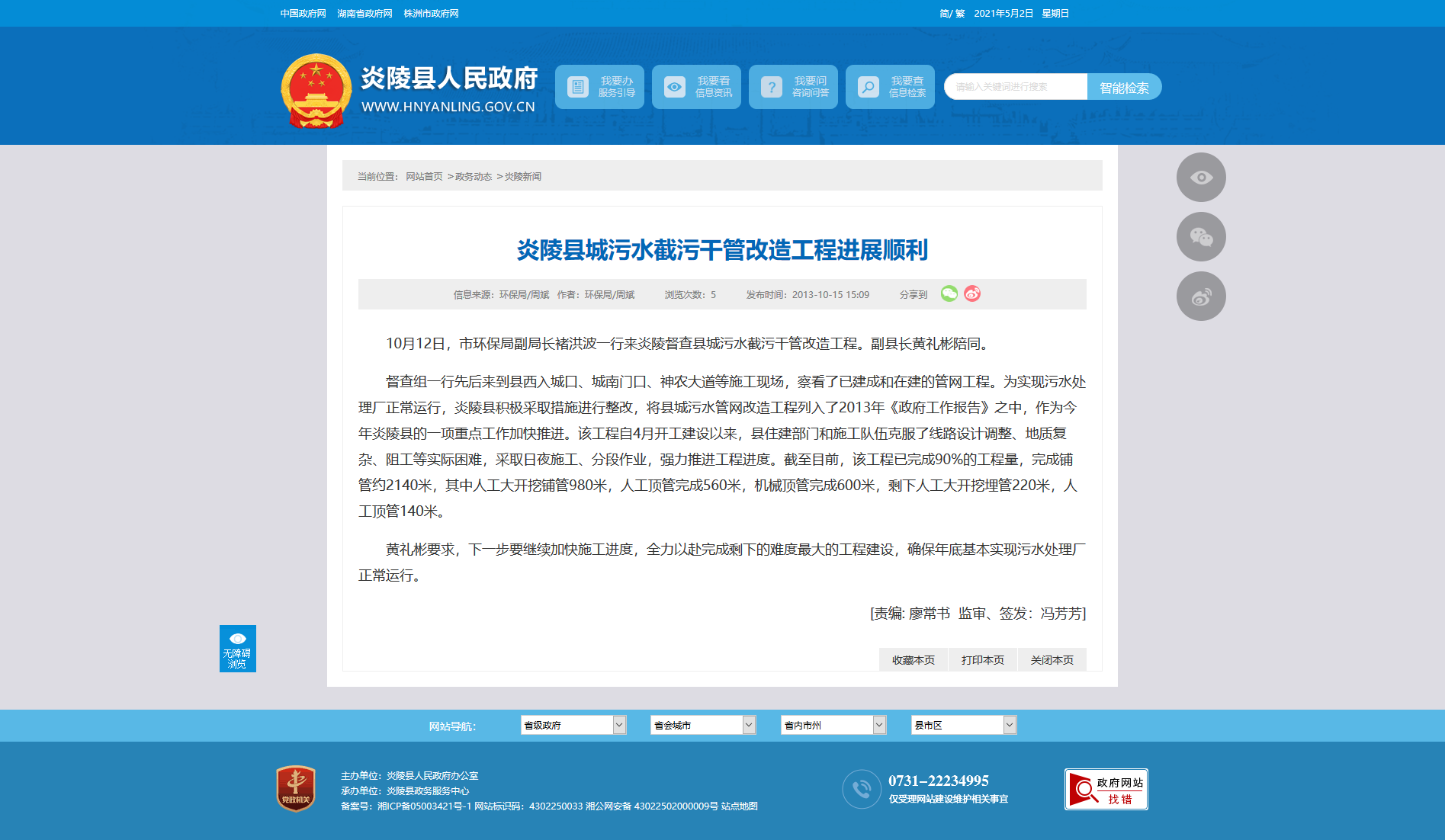 10月12日,市环保局副局长褚洪波一行来炎陵督查县城污水截污干管改造工程。副县长黄礼彬陪同。