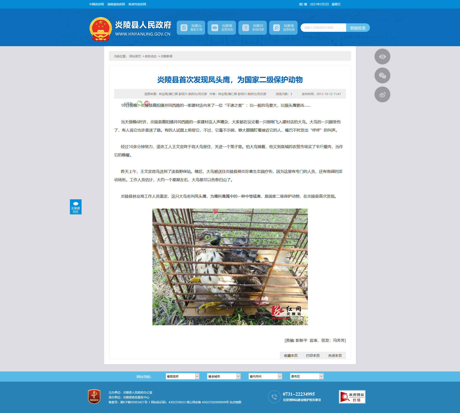 炎陵县首次发现凤头鹰,为国家二级保护动物