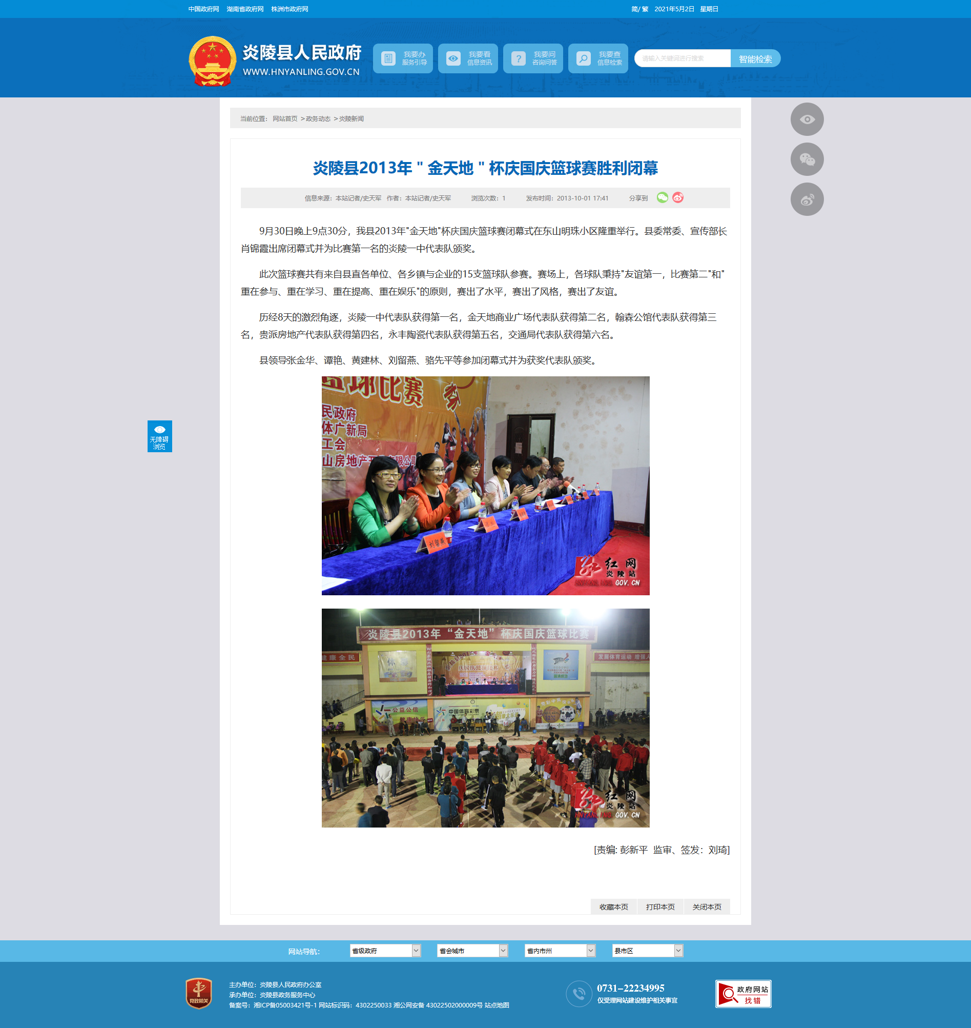 9月30日晚上9点30分,我县2013年"金天地"杯庆国庆篮球赛闭幕式在东山明珠小区隆重举行。县委常委、宣传部长肖锦霞出席闭幕式并为比赛第一名的炎陵一中代表队颁奖。