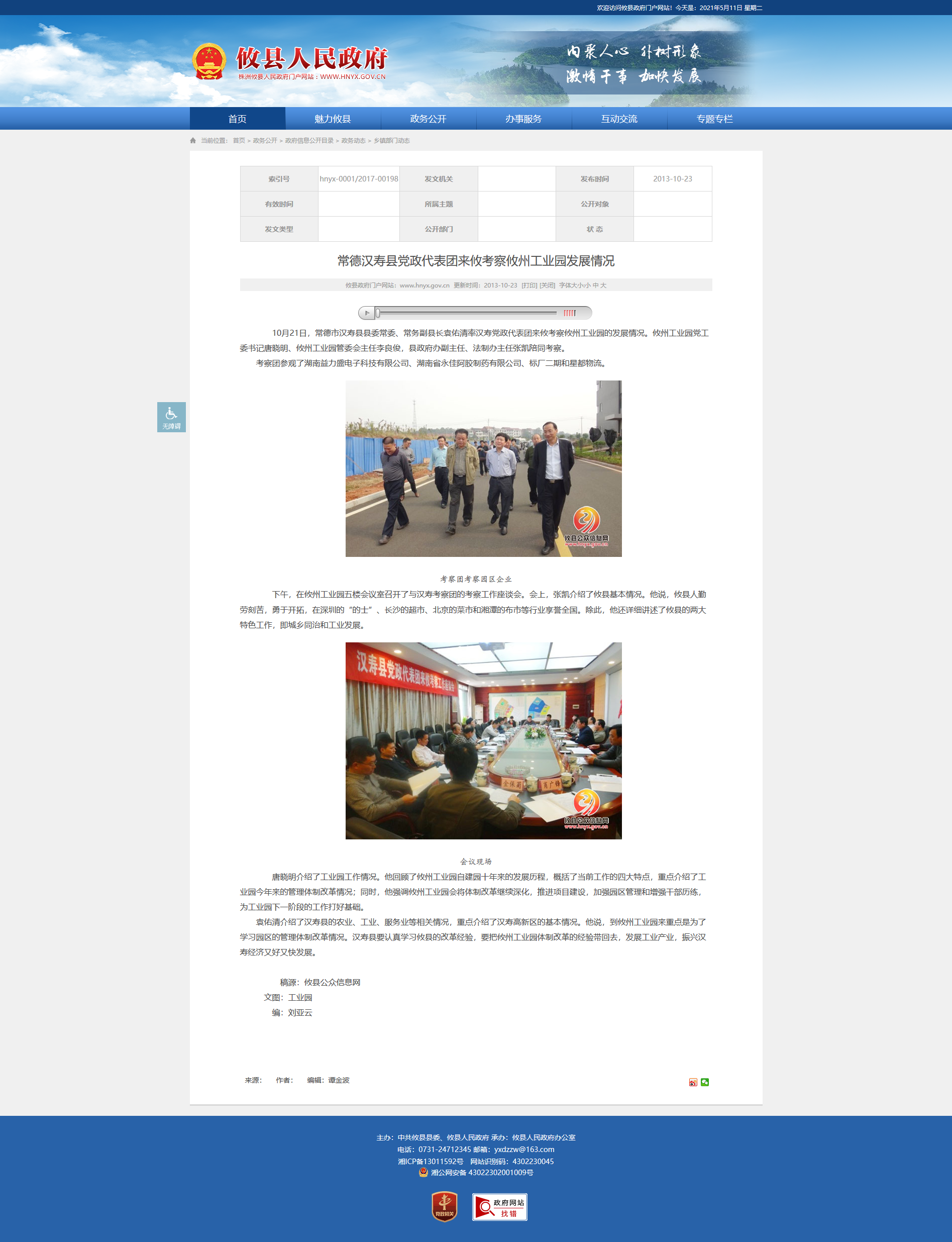 10月21日,常德市汉寿县县委常委、常务副县长袁佑清率汉寿党政代表团来攸考察攸州工业园的发展情况。攸州工业园党工委书记唐晓明、攸州工业园管委会主任李良俊,县政府办副主任、法制办主任张凯陪同考察。