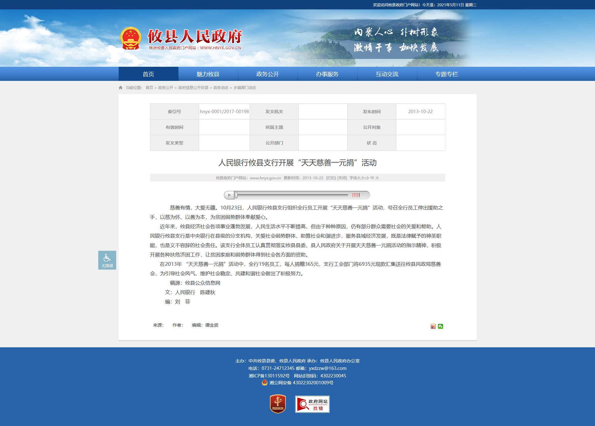 在2013年 “天天慈善一元捐”活动中,全行19名员工,每人捐赠365元,支行工会部门将6935元现款汇集送往攸县民政局慈善会,为引导社会风气、维护社会稳定、共建和谐社会做出了积极努力。