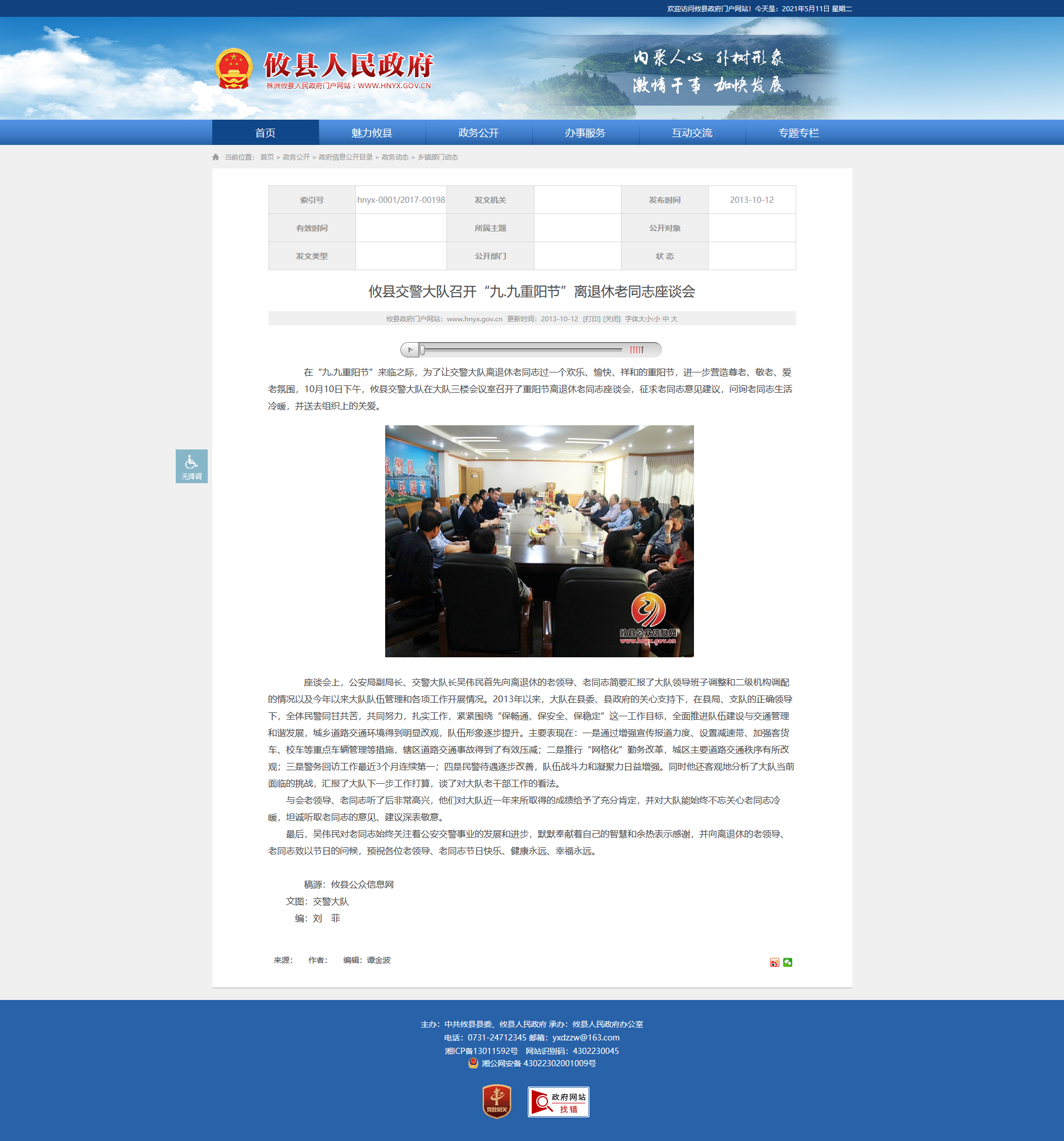 在“九.九重阳节”来临之际,为了让交警大队离退休老同志过一个欢乐、愉快、祥和的重阳节,进一步营造尊老、敬老、爱老氛围,10月10日下午,攸县交警大队在大队三楼会议室召开了重阳节离退休老同志座谈会,征求老同志意见建议,问询老同志生活冷暖,并送去组织上的关爱。