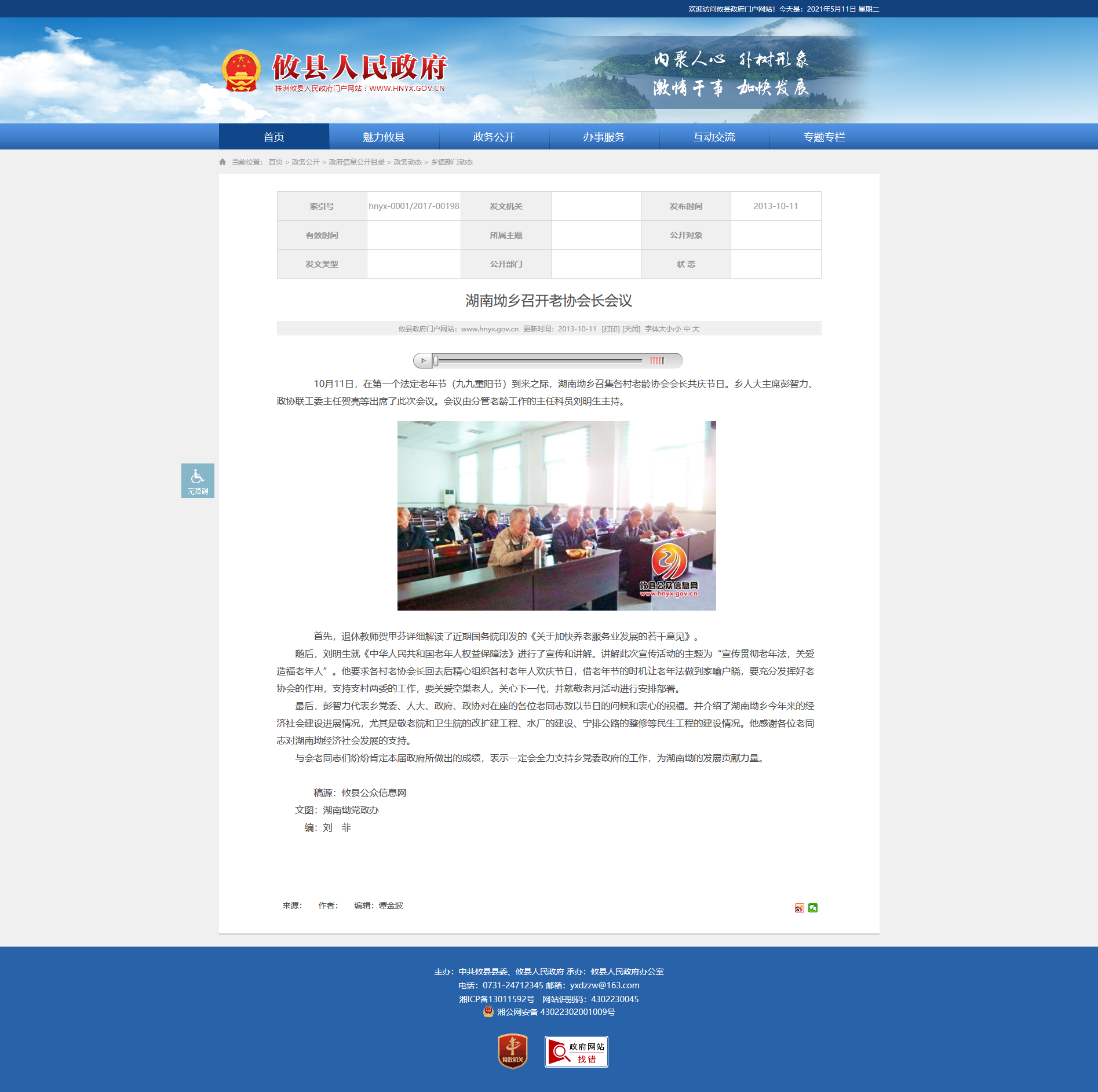 10月11日,在第一个法定老年节(九九重阳节)到来之际,湖南坳乡召集各村老龄协会会长共庆节日。乡人大主席彭智力、政协联工委主任贺亮等出席了此次会议。会议由分管老龄工作的主任科员刘明生主持。