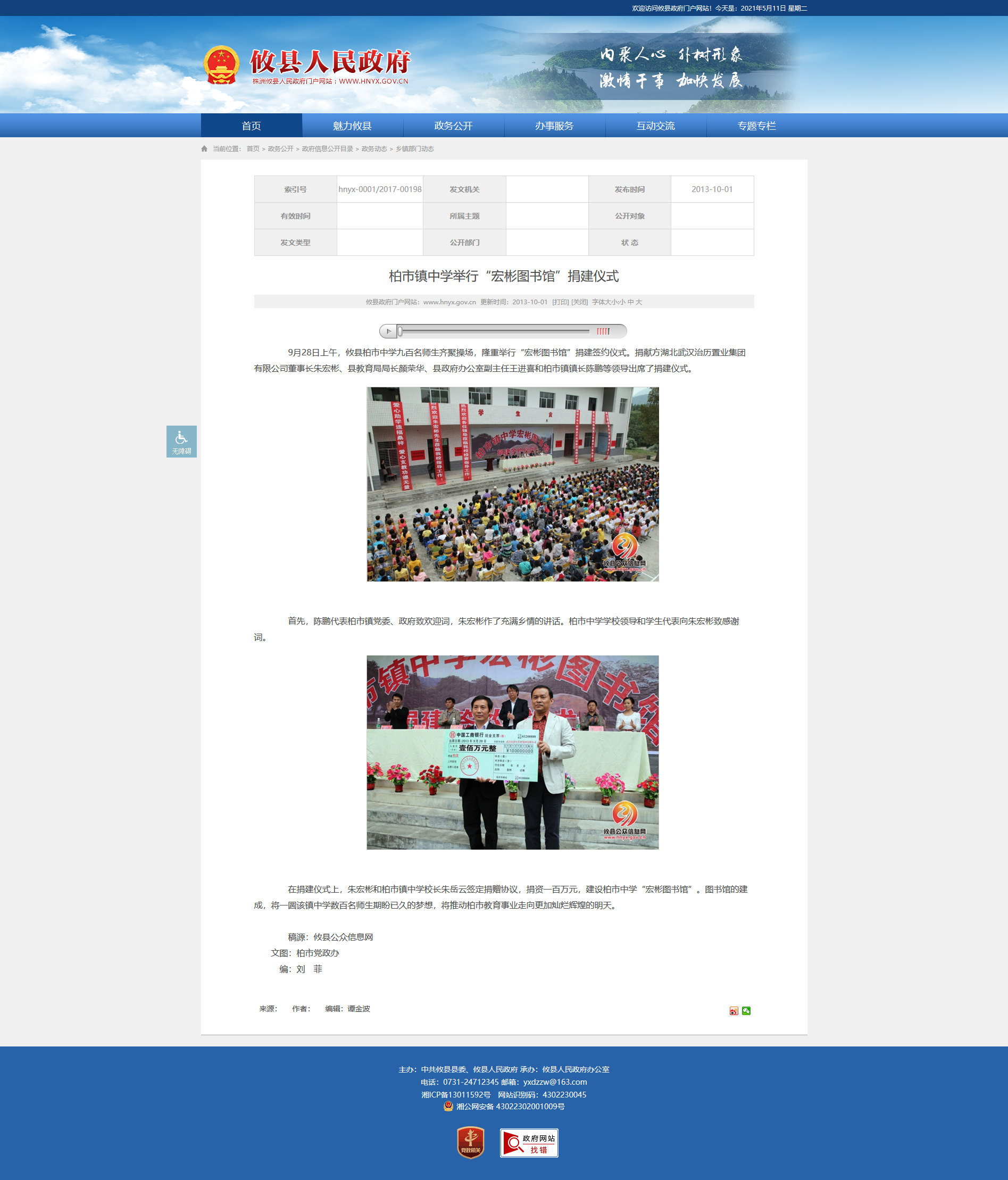 9月28日上午,攸县柏市中学九百名师生齐聚操场,隆重举行“宏彬图书馆”捐建签约仪式。捐献方湖北武汉治历置业集团有限公司董事长朱宏彬、县教育局局长颜荣华、县政府办公室副主任王进喜和柏市镇镇长陈鹏等领导出席了捐建仪式。