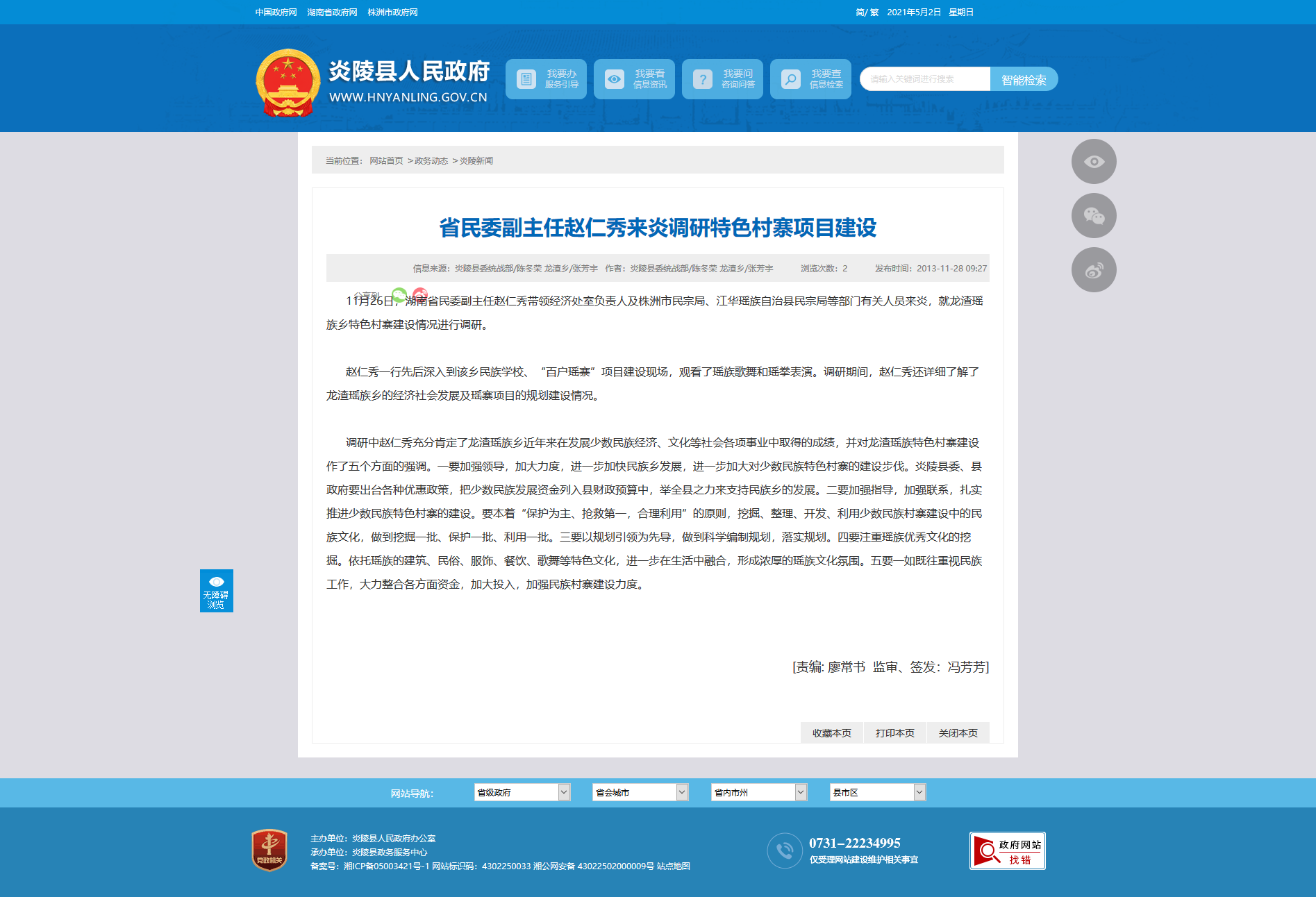 11月26日,湖南省民委副主任赵仁秀带领经济处室负责人及株洲市民宗局、江华瑶族自治县民宗局等部门有关人员来炎,就龙渣瑶族乡特色村寨建设情况进行调研。