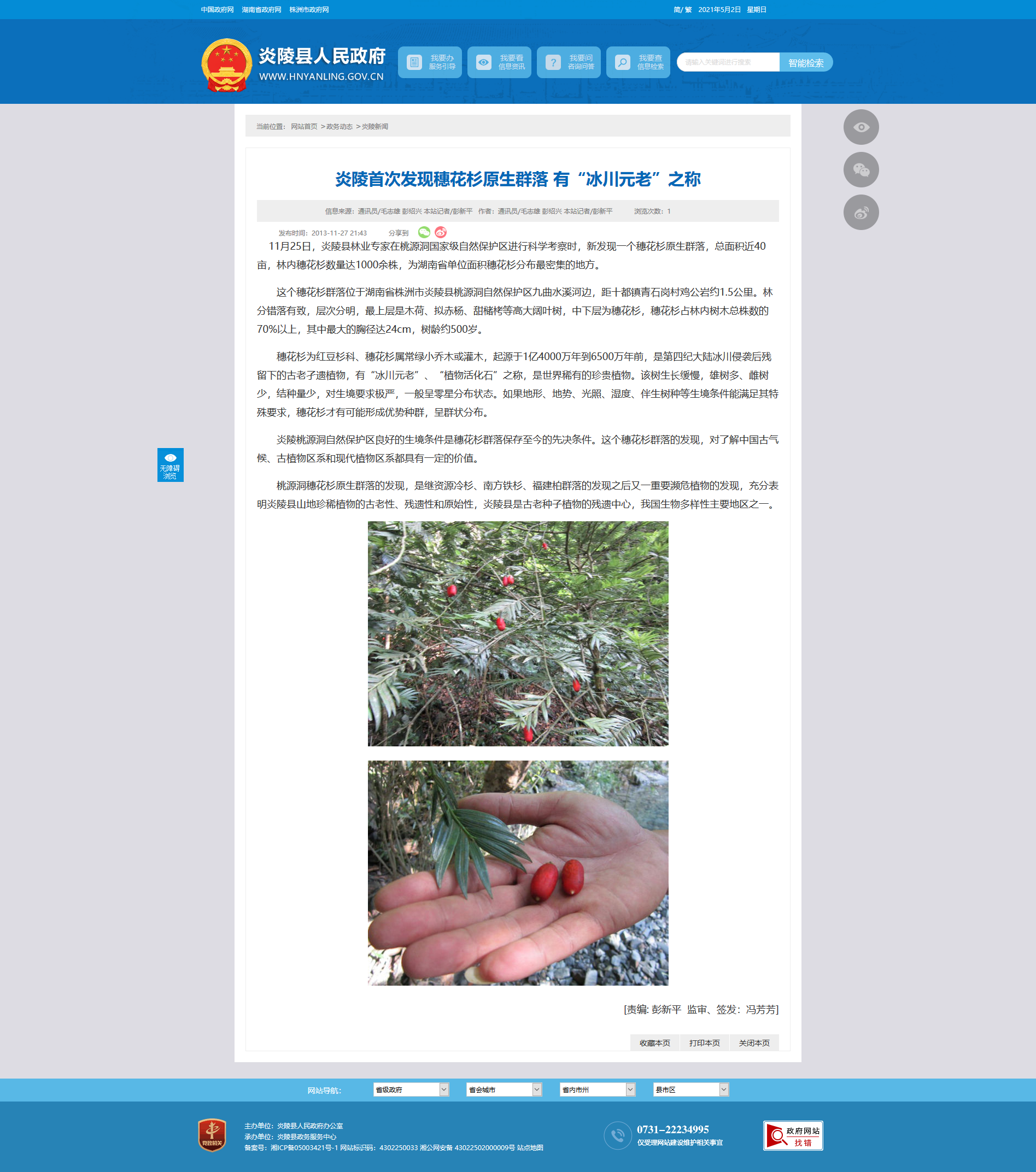 11月25日,炎陵县林业专家在桃源洞国家级自然保护区进行科学考察时,新发现一个穗花杉原生群落,总面积近40亩,林内穗花杉数量达1000余株,为湖南省单位面积穗花杉分布最密集的地方。