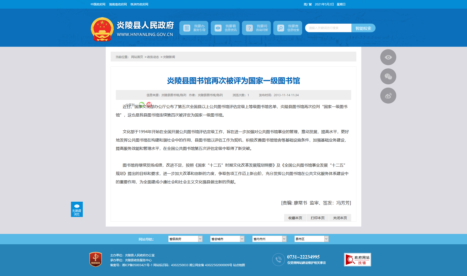 炎陵县图书馆再次被评为国家一级图书馆