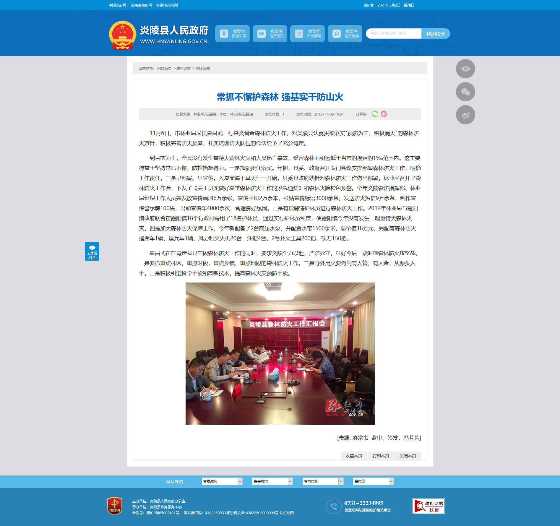 夏昌武在在肯定我县前段森林防火工作的同时,要求炎陵全力以赴,严防死守,打好今后一段时期森林防火攻坚战,一是要抓重点林区,重点时段,重点乡镇,重点地段的森林防火工作。二是野外用火要做到有人管,有人查,从源头入手。三是积极引进科学手段和高新技术,提高森林火灾预防手段。