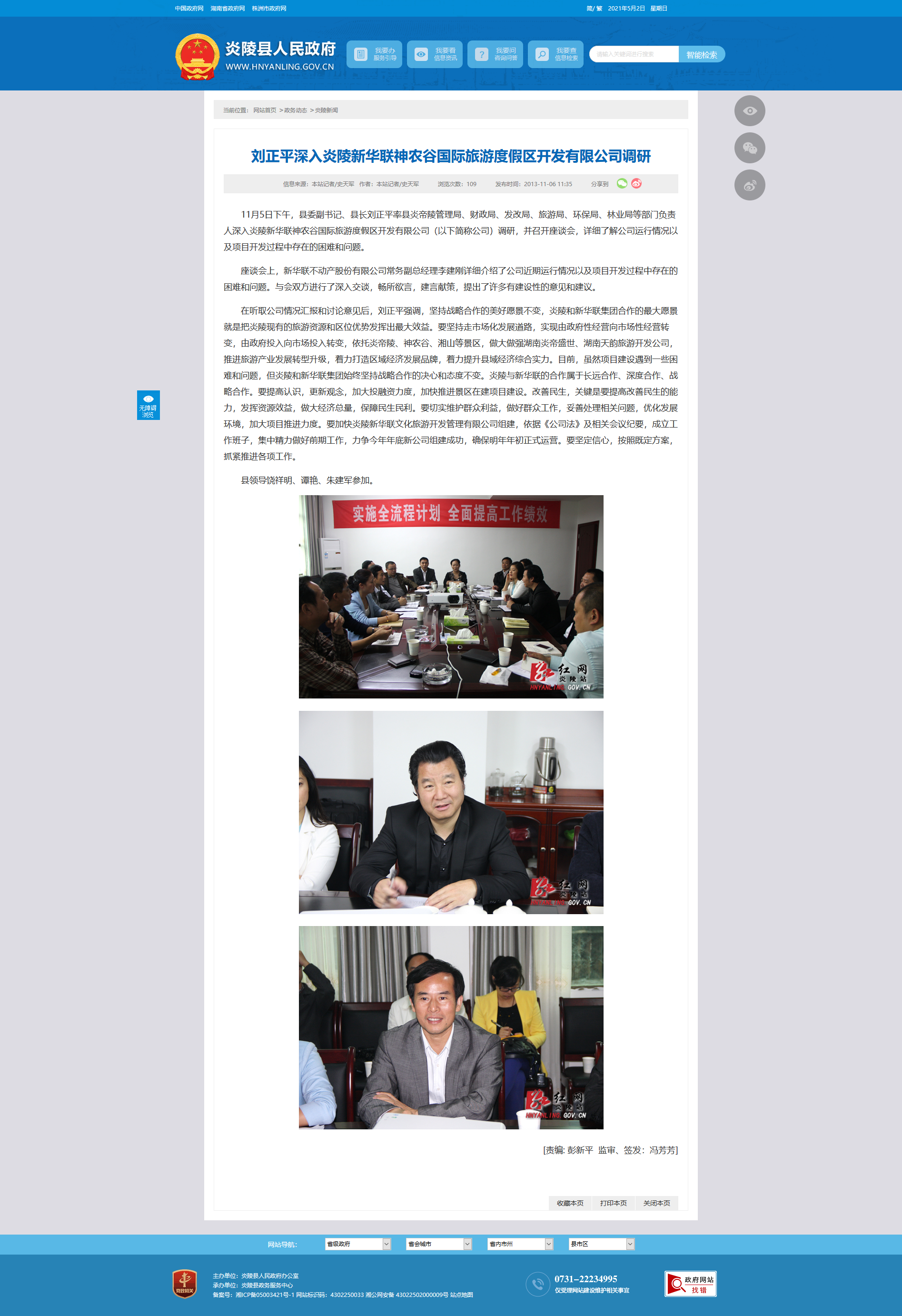 11月5日下午,县委副书记、县长刘正平率县炎帝陵管理局、财政局、发改局、旅游局、环保局、林业局等部门负责人深入炎陵新华联神农谷国际旅游度假区开发有限公司(以下简称公司)调研,并召开座谈会,详细了解公司运行情况以及项目开发过程中存在的困难和问题。