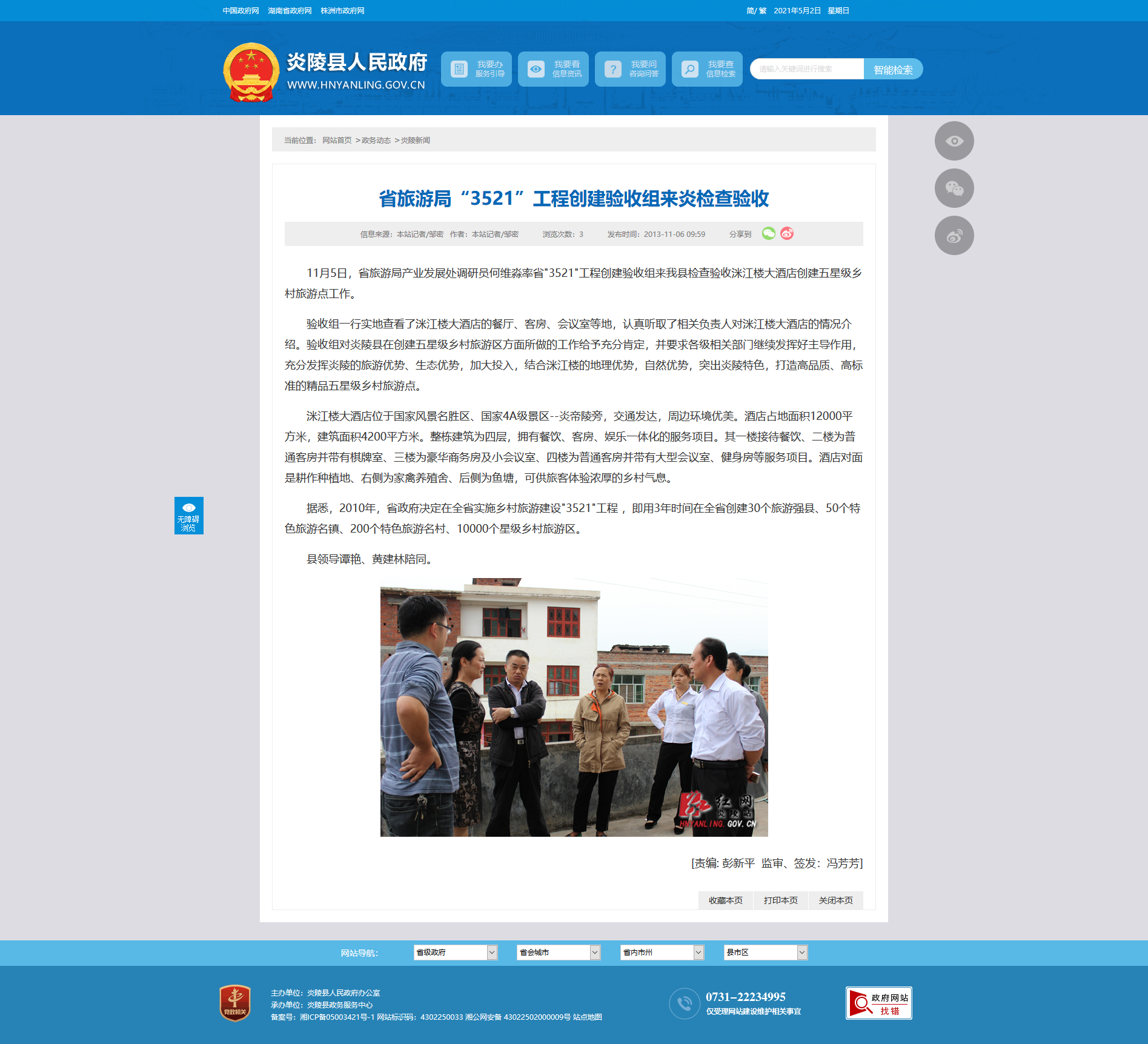 11月5日,省旅游局产业发展处调研员何维淼率省"3521"工程创建验收组来我县检查验收洣江楼大酒店创建五星级乡村旅游点工作。