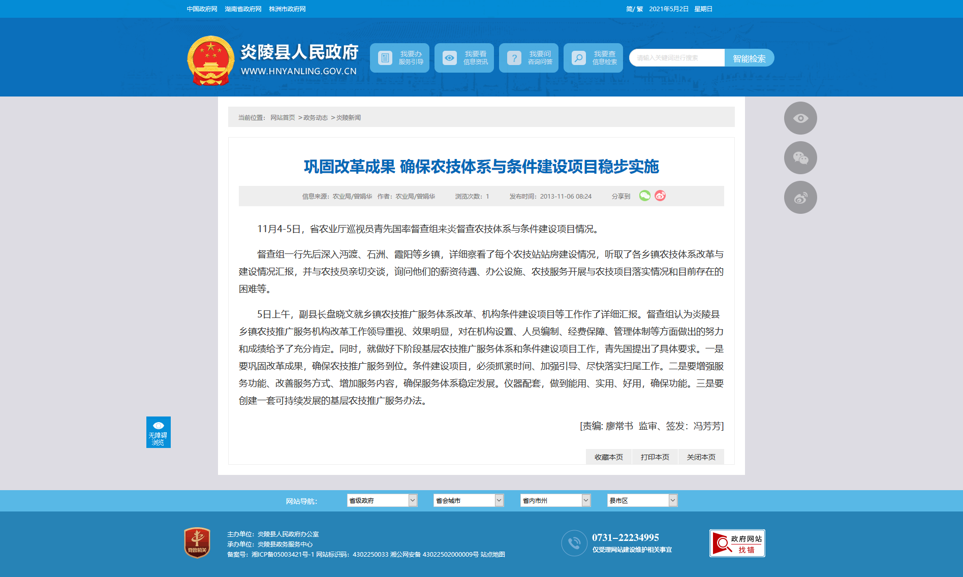 11月4-5日,省农业厅巡视员青先国率督查组来炎督查农技体系与条件建设项目情况。