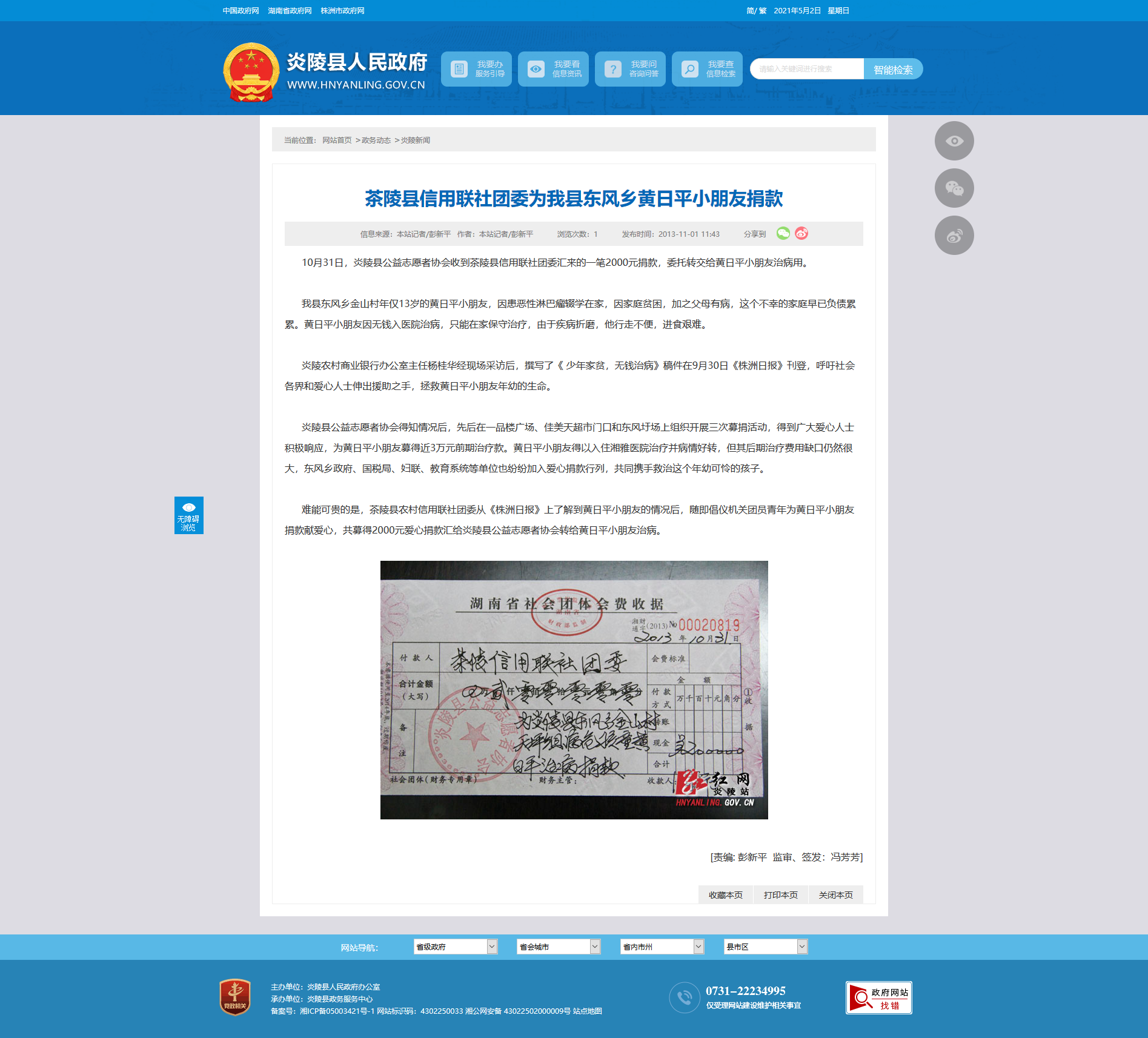 10月31日,炎陵县公益志愿者协会收到茶陵县信用联社团委汇来的一笔2000元捐款,委托转交给黄日平小朋友治病用。