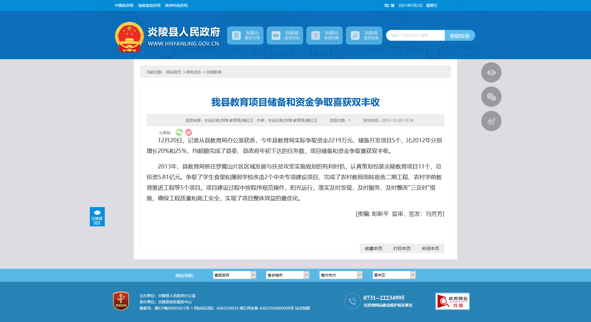 2013年,县教育局抓住罗霄山片区区域发展与扶贫攻坚实施规划的有利时机,认真策划包装炎陵教育项目11个,总投资5.81亿元。争取了学生食堂和薄弱学校改造2个中央专项建设项目,完成了农村教师周转宿舍二期工程、农村学前教育推进工程等5个项目。项目建设过程中按程序规范操作,阳光运行,落实及时发现、及时服务、及时整改"三及时"措施,确保工程质量和施工安全,实现了项目整体效益的最优化。