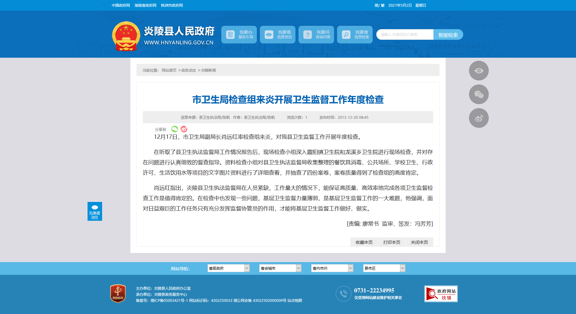 12月17日,市卫生局副局长肖远红率检查组来炎,对我县卫生监督工作开展年度检查。