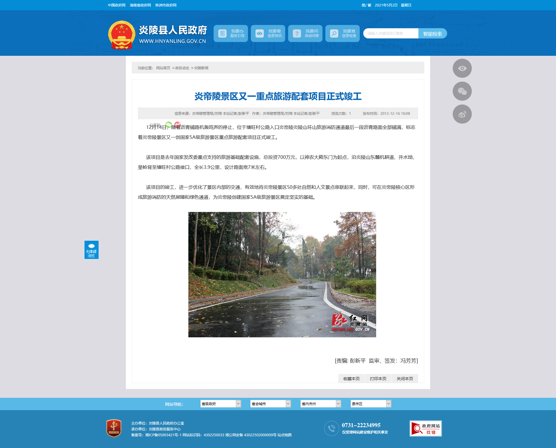 12月14日,随着沥青铺路机轰鸣声的停止,位于塘旺村公路入口炎帝陵炎陵山环山旅游消防通道最后一段沥青路面全部铺满,标志着炎帝陵景区又一创国家5A级旅游景区重点旅游配套项目正式竣工。
