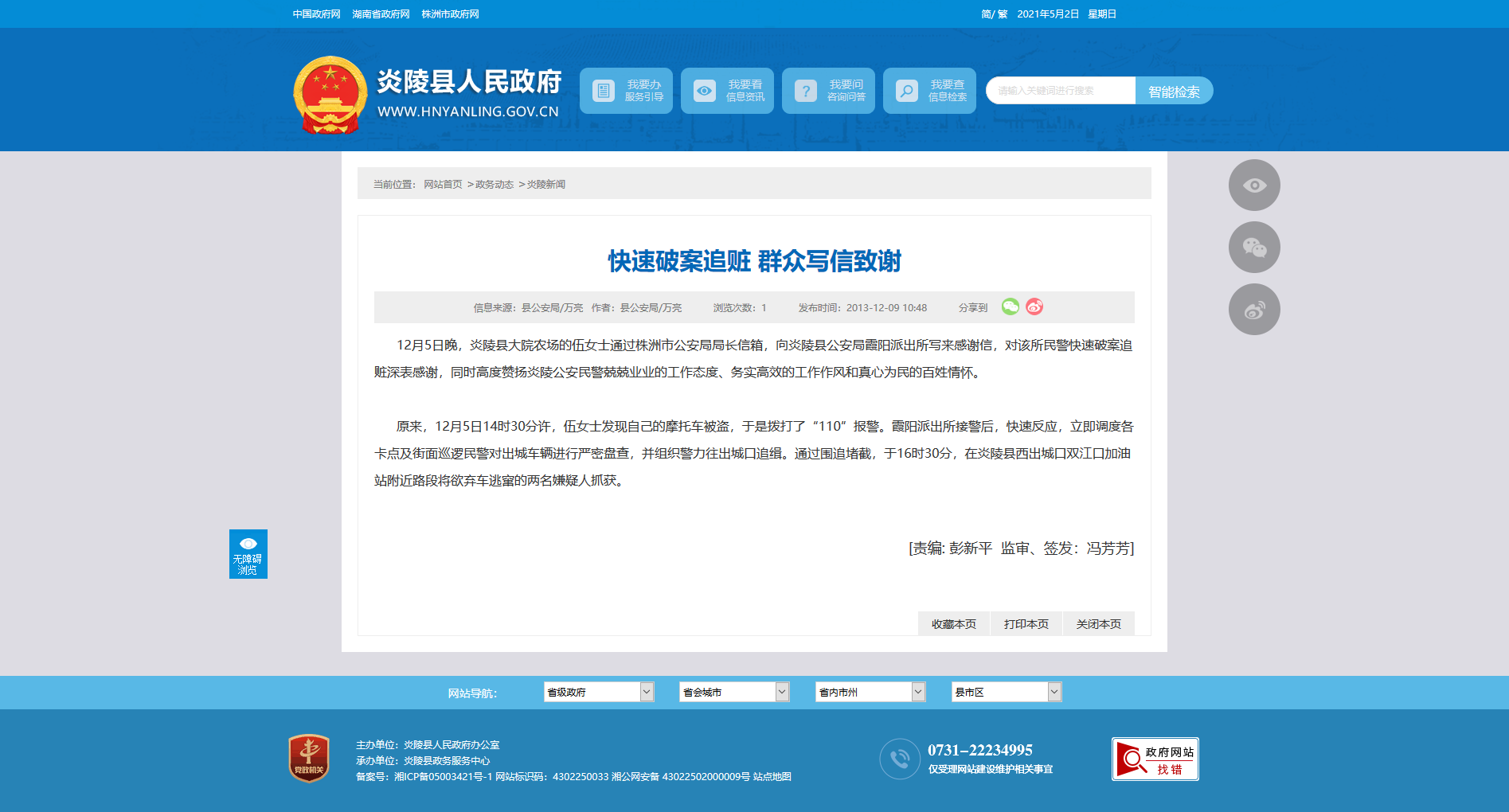 12月5日晚,炎陵县大院农场的伍女士通过株洲市公安局局长信箱,向炎陵县公安局霞阳派出所写来感谢信,对该所民警快速破案追赃深表感谢,同时高度赞扬炎陵公安民警兢兢业业的工作态度、务实高效的工作作风和真心为民的百姓情怀。