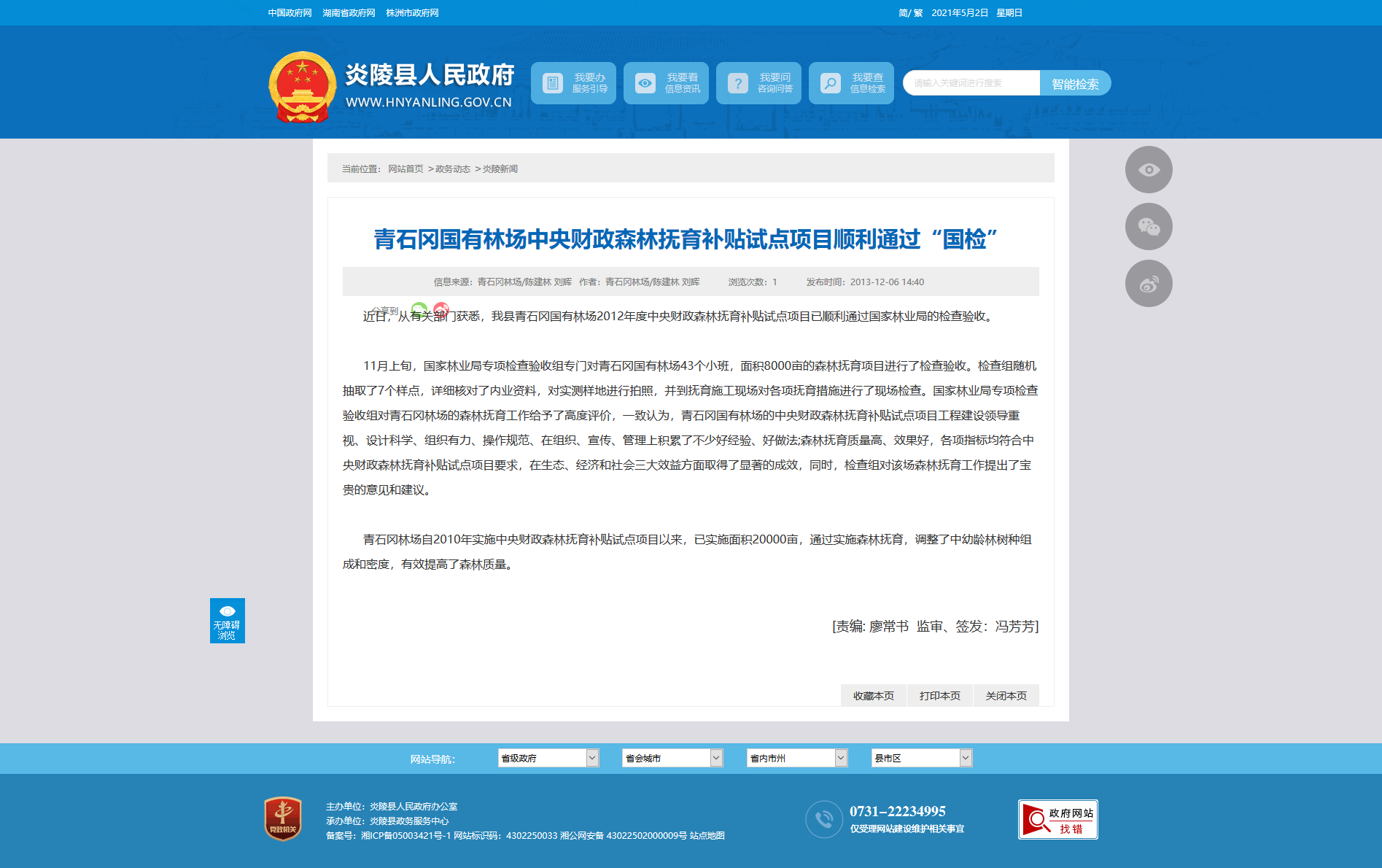 近日,从有关部门获悉,我县青石冈国有林场2012年度中央财政森林抚育补贴试点项目已顺利通过国家林业局的检查验收。