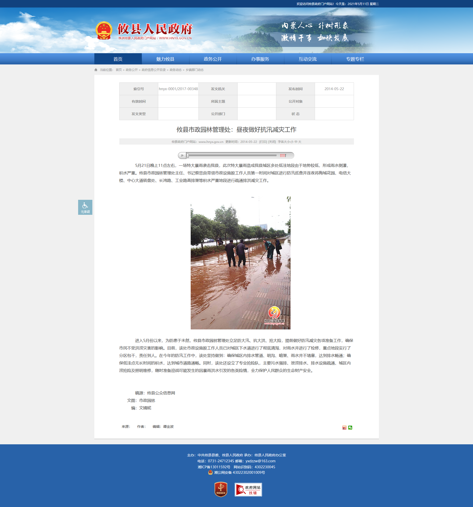 5月21日晚上11点左右,一场特大暴雨袭击我县,此次特大暴雨造成我县城区多处低洼地段由于地势较低,形成雨水倒灌,积水严重。攸县市政园林管理处主任、书记蔡忠良带领市政设施股工作人员第一时间对城区进行防汛巡查并连夜将梅城花园、电信大楼、中心大道转盘处、长鸿路、工业路高排渠等积水严重地段进行疏通排洪减灾工作。