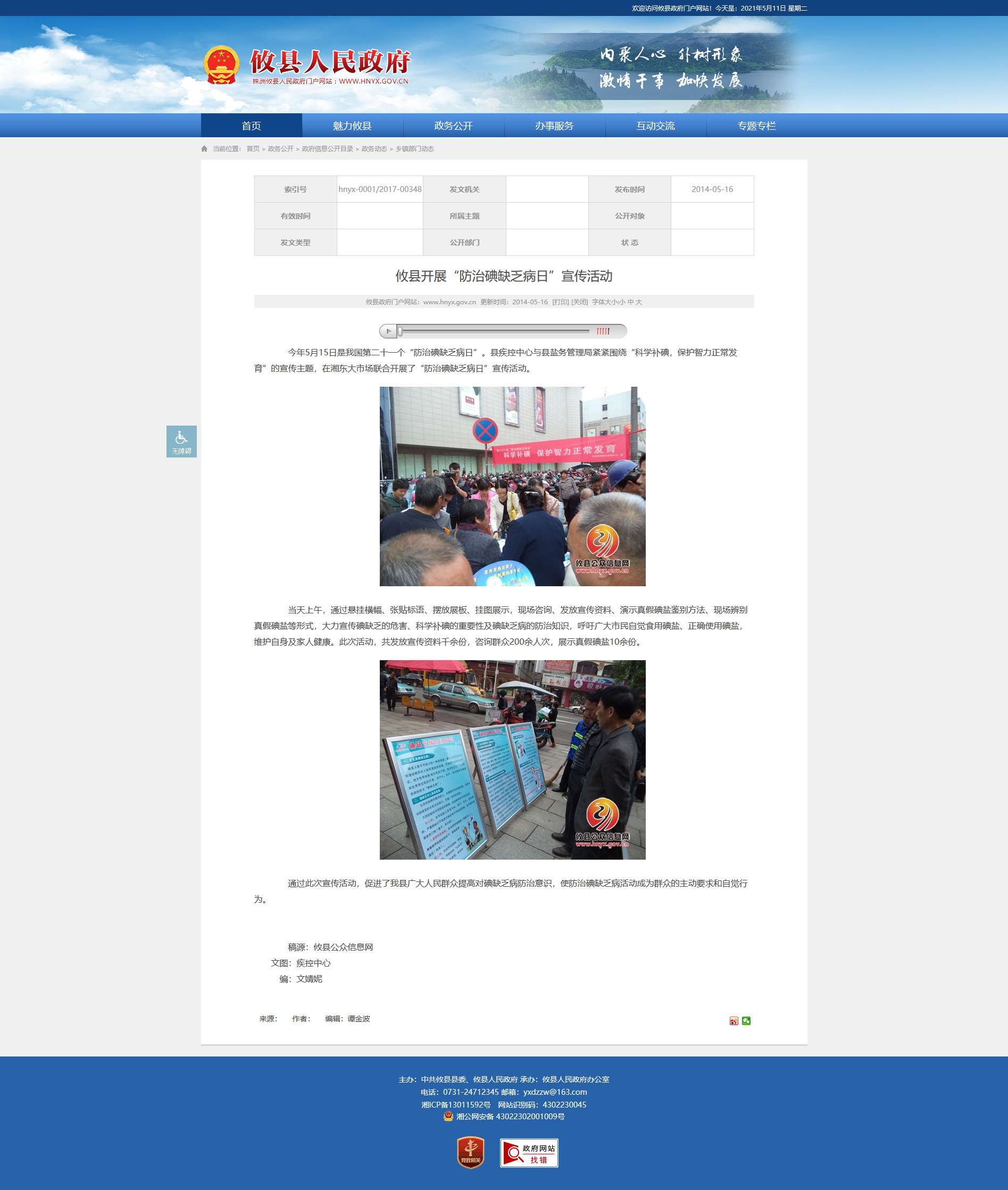 今年5月15日是我国第二十一个“防治碘缺乏病日”。县疾控中心与县盐务管理局紧紧围绕“科学补碘,保护智力正常发育”的宣传主题,在湘东大市场联合开展了“防治碘缺乏病日”宣传活动。