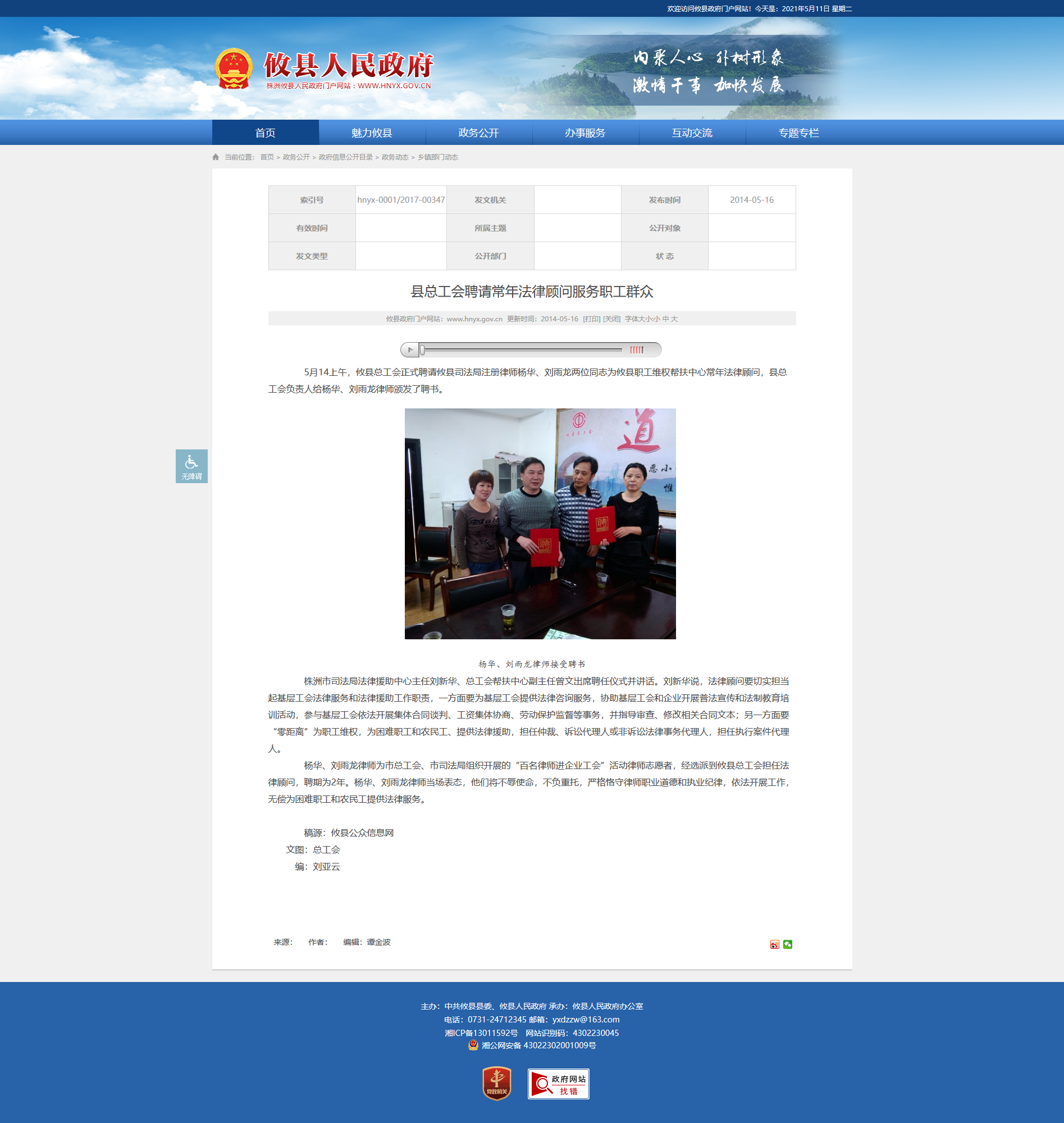 5月14上午,攸县总工会正式聘请攸县司法局注册律师杨华、刘雨龙两位同志为攸县职工维权帮扶中心常年法律顾问,县总工会负责人给杨华、刘雨龙律师颁发了聘书。