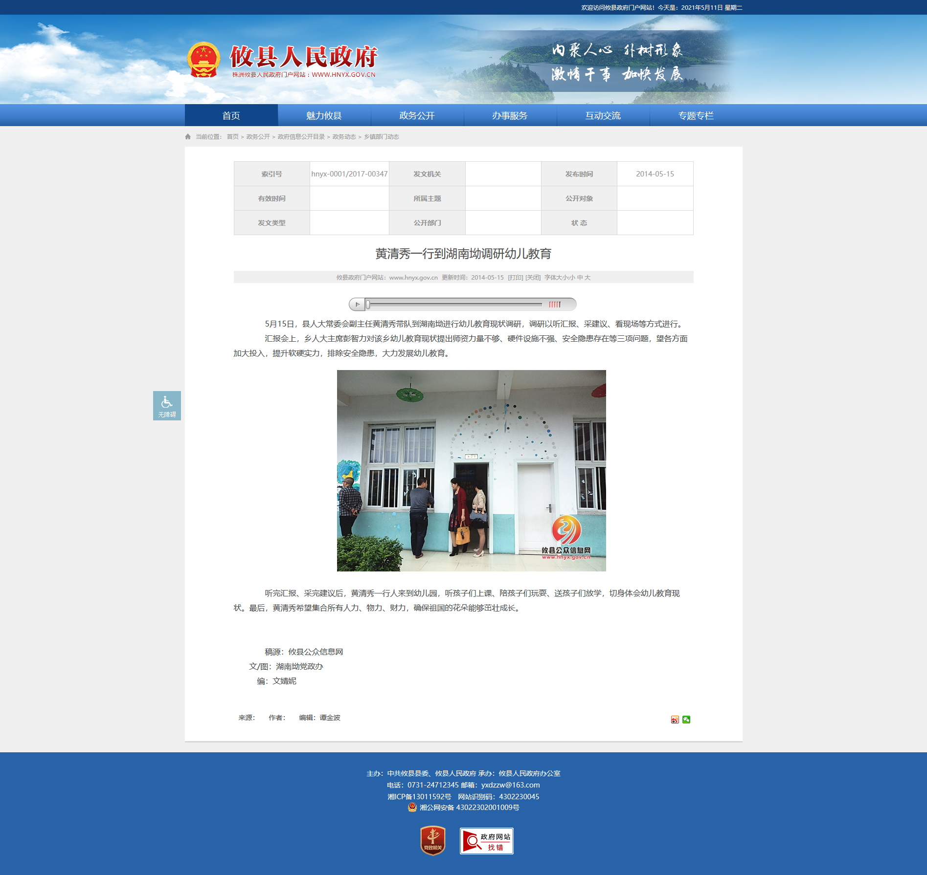 5月15日,县人大常委会副主任黄清秀带队到湖南坳进行幼儿教育现状调研,调研以听汇报、采建议、看现场等方式进行。