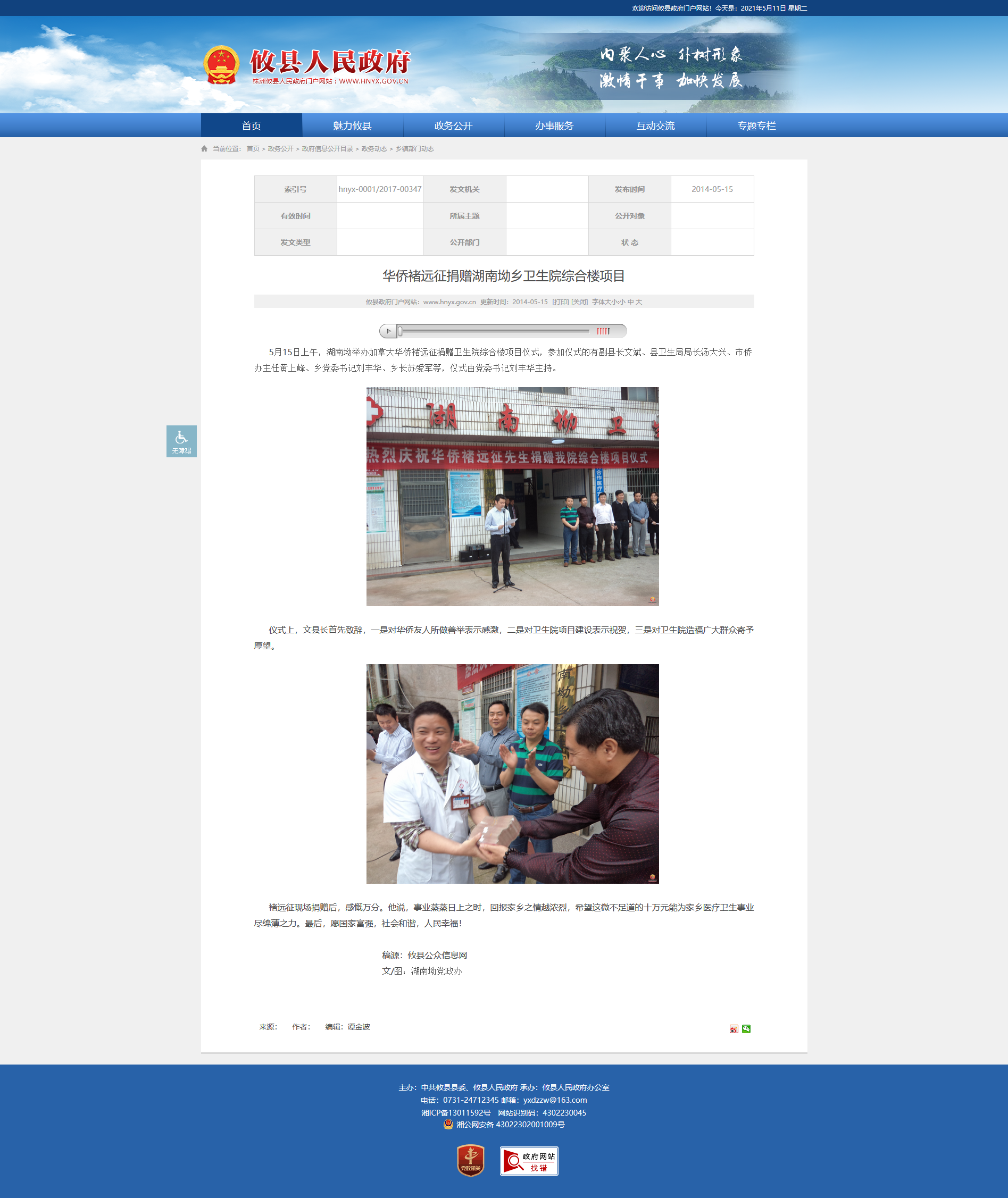 5月15日上午,湖南坳举办加拿大华侨褚远征捐赠卫生院综合楼项目仪式,参加仪式的有副县长文斌、县卫生局局长汤大兴、市侨办主任黄上峰、乡党委书记刘丰华、乡长苏爱军等,仪式由党委书记刘丰华主持。