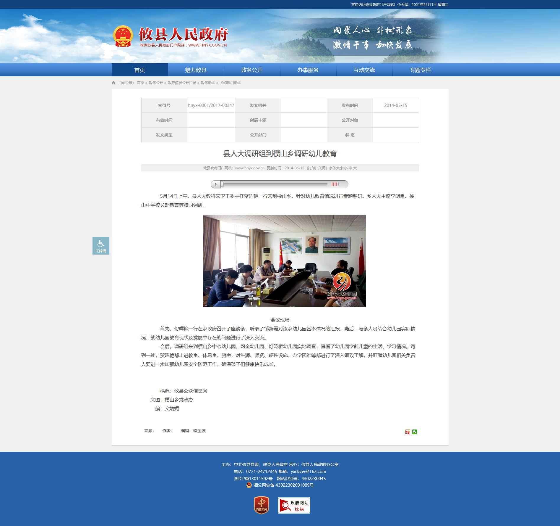 5月14日上午,县人大教科文卫工委主任贺晖艳一行来到槚山乡,针对幼儿教育情况进行专题调研。乡人大主席李明良、槚山中学校长邹新霞等陪同调研。